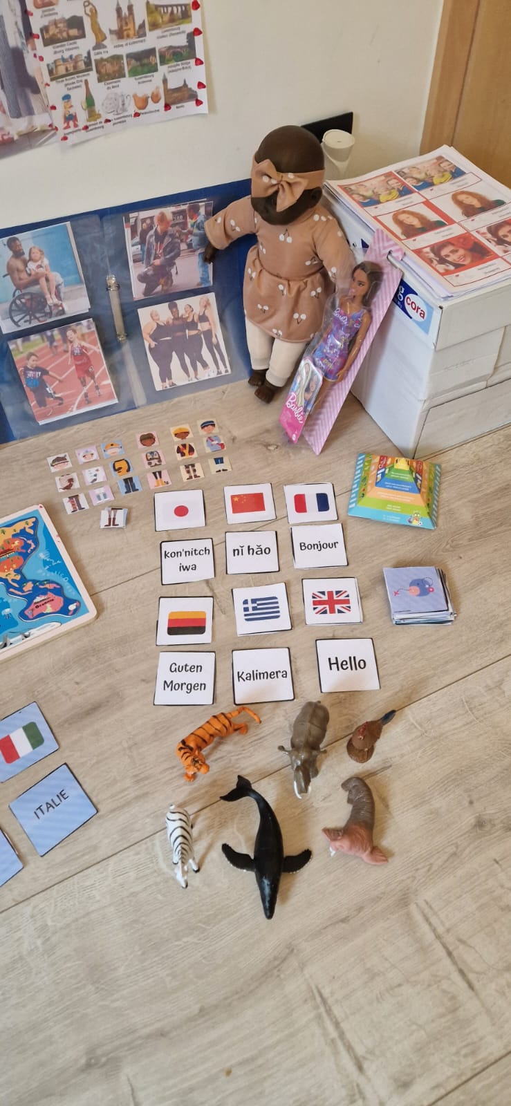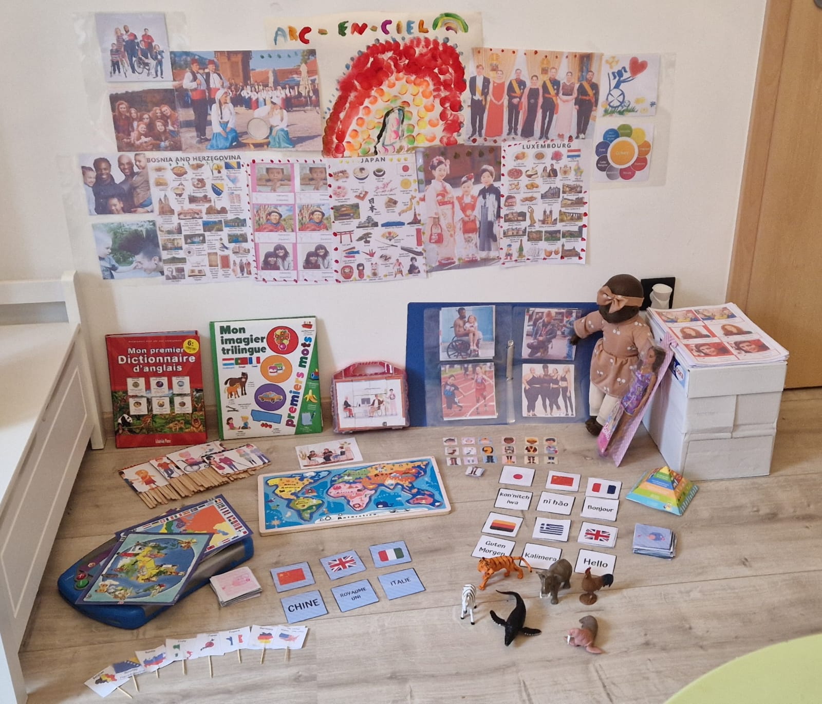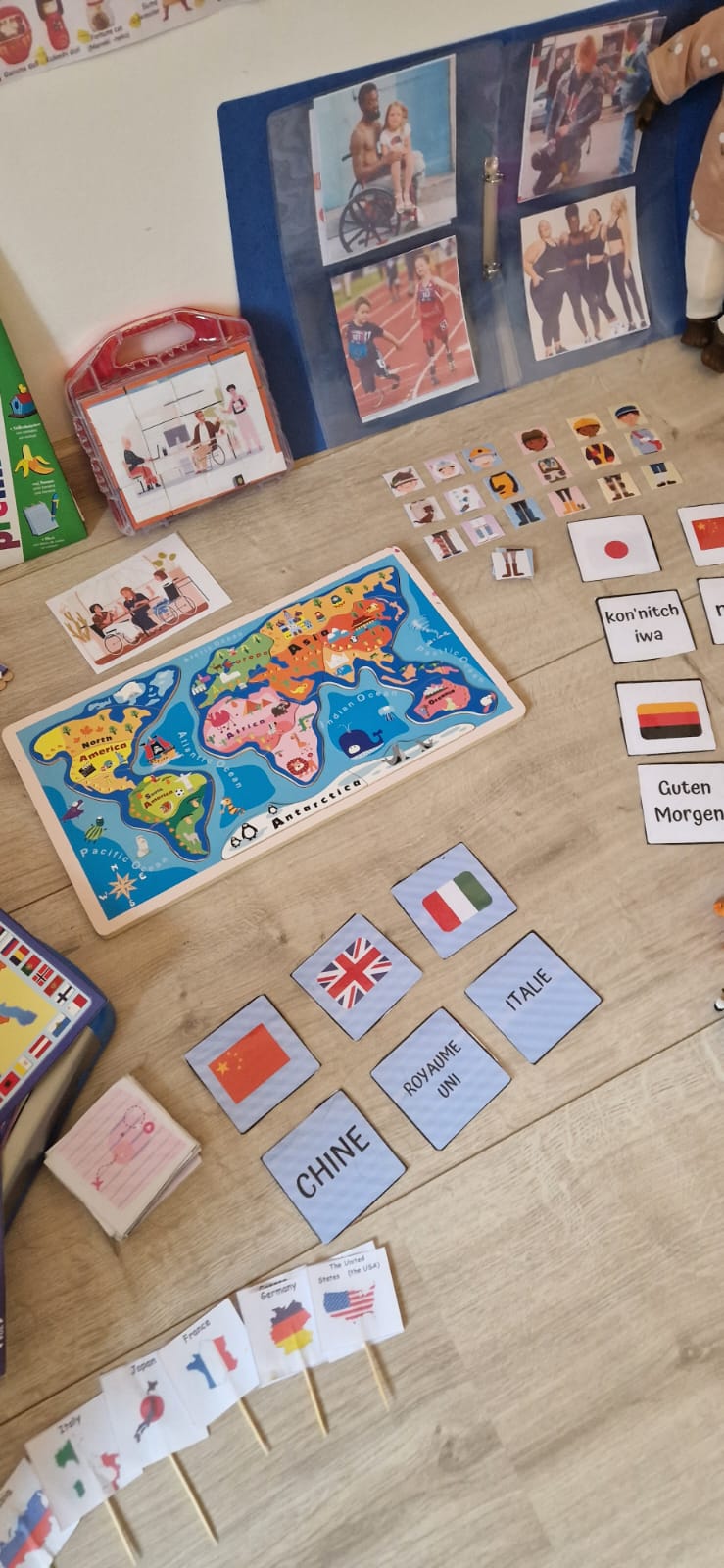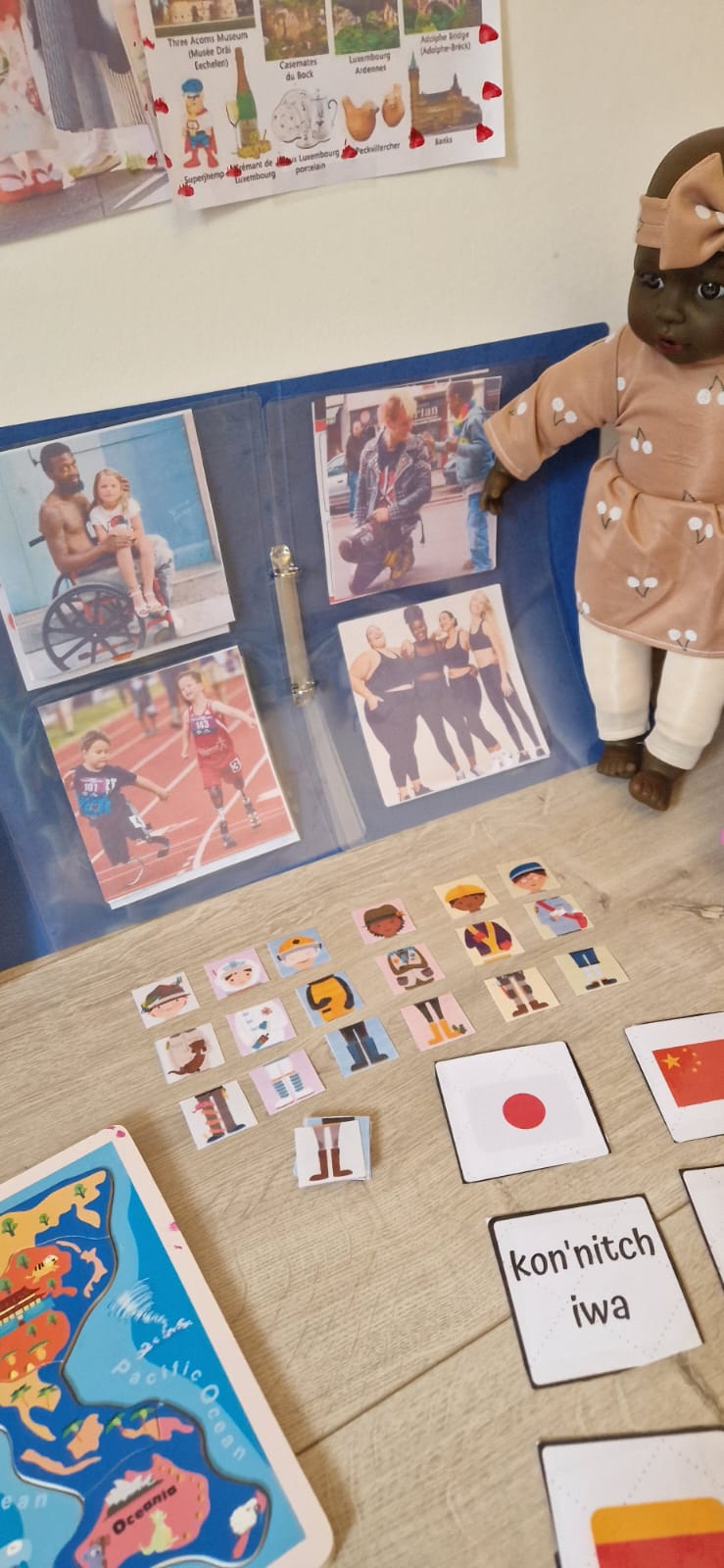 Après nous avons complété avec des jeux créés par nous, 2 jeux « mémoire » avec des drapeaux, le nom du pays, et « bonjour » en différentes langues, 3 puzzles avec des images montrant des personnes avec un handicap, 1 jeu d’assemblage avec des métiers et ethnicité différant et 1 classeur avec des images valorisant la diversité.