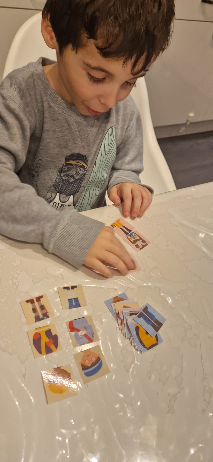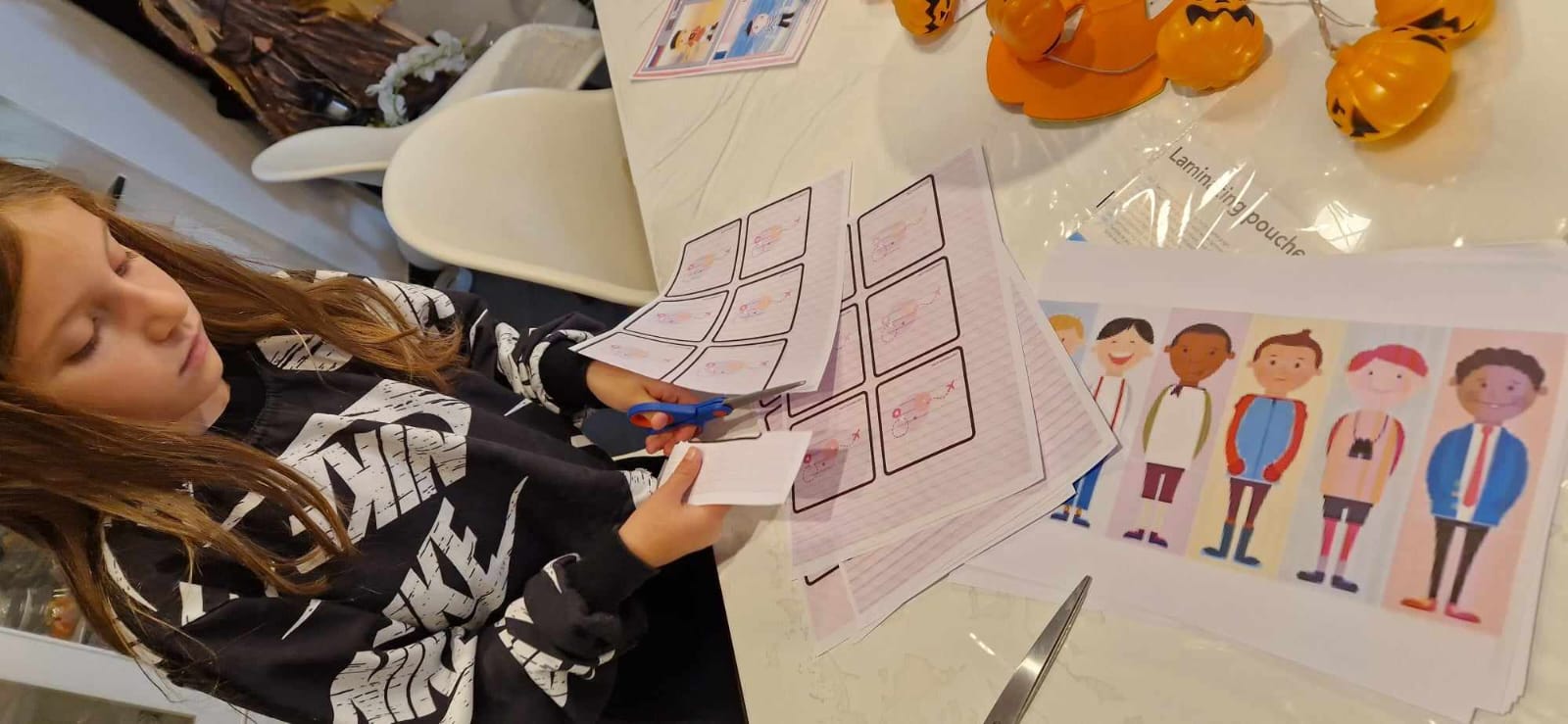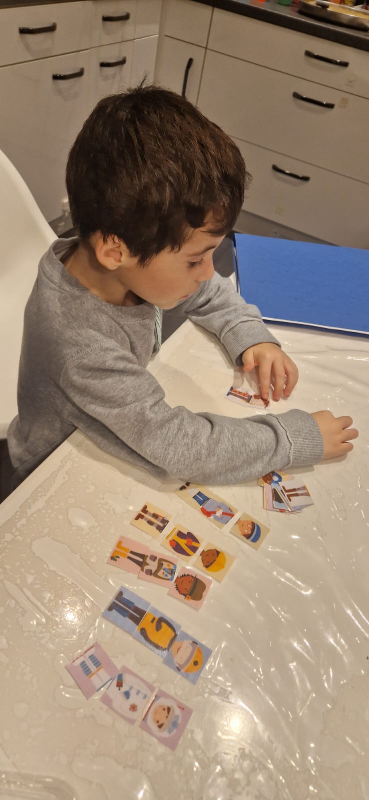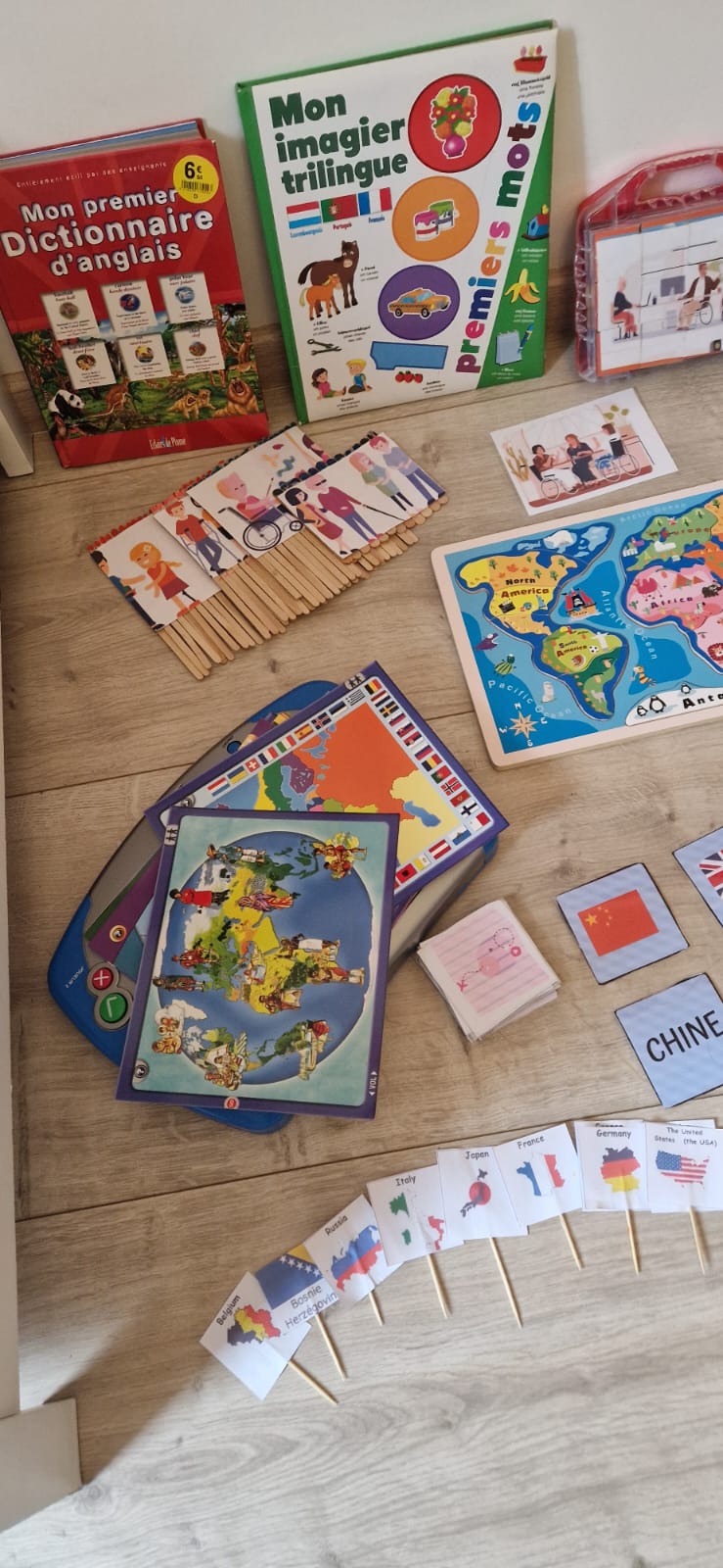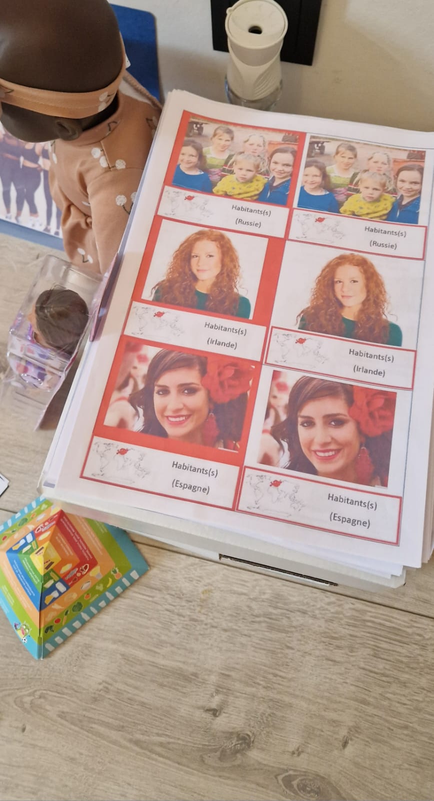 Après nous avons complété avec des jeux créés par nous, 2 jeux « mémoire » avec des drapeaux, le nom du pays, et « bonjour » en différentes langues, 3 puzzles avec des images montrant des personnes avec un handicap, 1 jeu d’assemblage avec des métiers et ethnicité différant et 1 classeur avec des images valorisant la diversité.