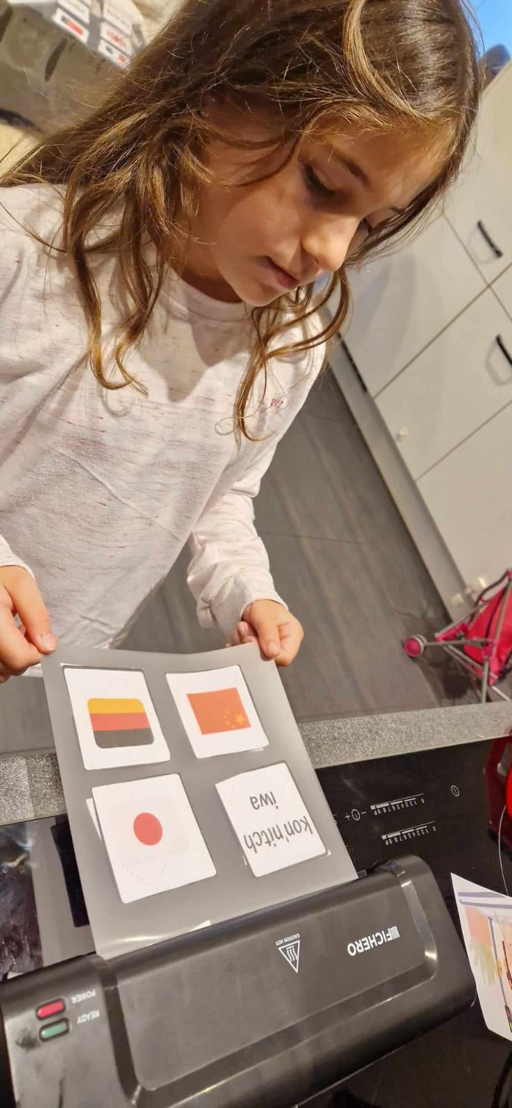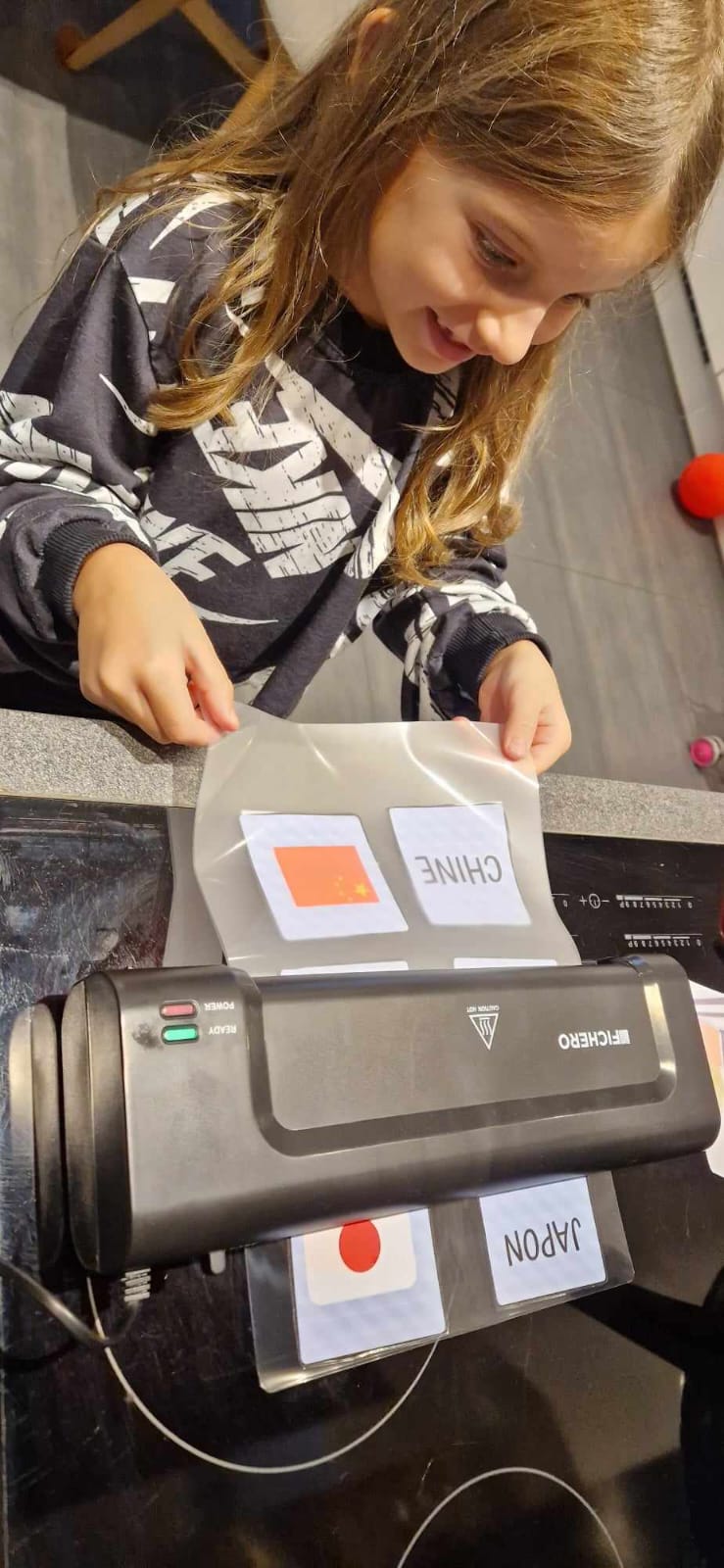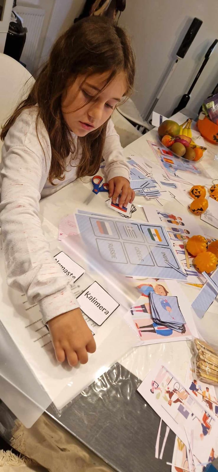 Par la suite, nous avons consacré 2 semaines à la cuisine du monde. Chaque jour nous avons préparé 3 plats de pays différents, avec des fiches informatives sur chaque pays, culture, apparence physique, drapeau, le bonjour dans la langue du pays, ainsi qu’un globe pour retrouver le pays correspondant à chaque plat.