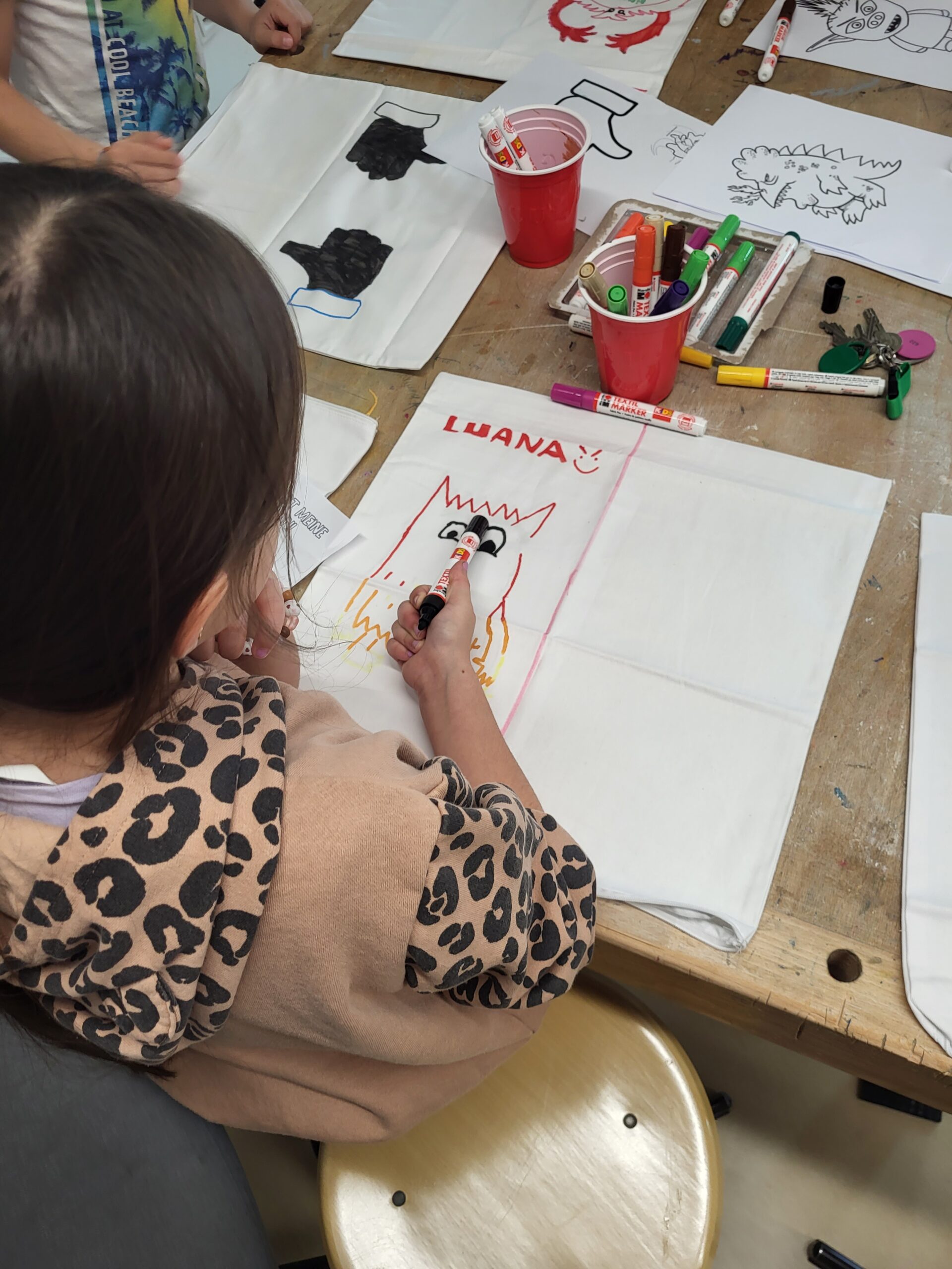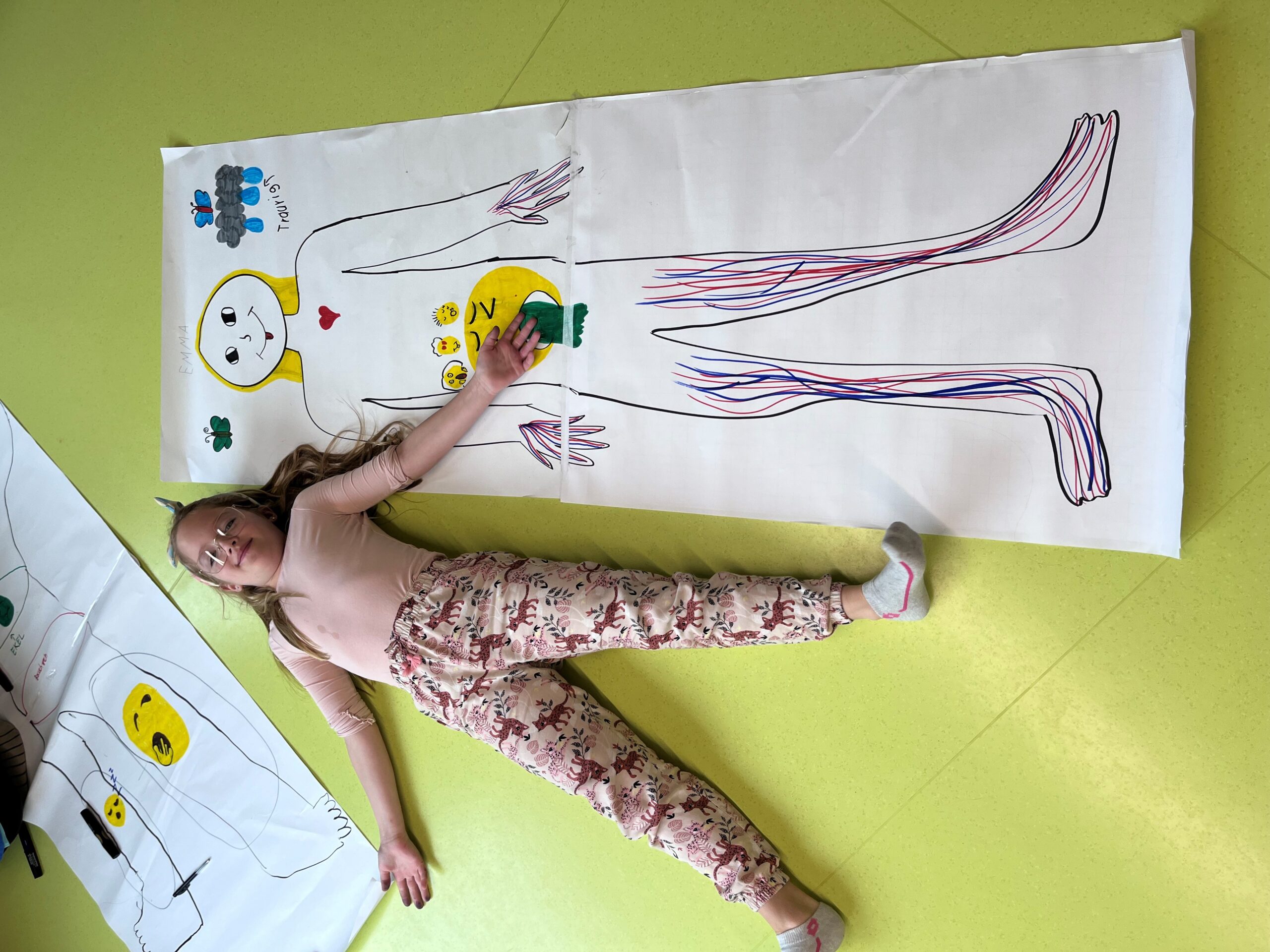 Atelier 1 : Où sont les microbes ? Comment en prendre soin ? Les enfants accrochent des microbes en peluche sur un poster représentant le corps humain et sur un poster représentant l’environnement. Nous expliquons que les microbes sont partout et que nous vivons ensemble. Nous expliquons également comment prendre soin de nos microbes grâce à l’alimentation en demandant aux enfants de coller différents types d’aliments sur les posters.