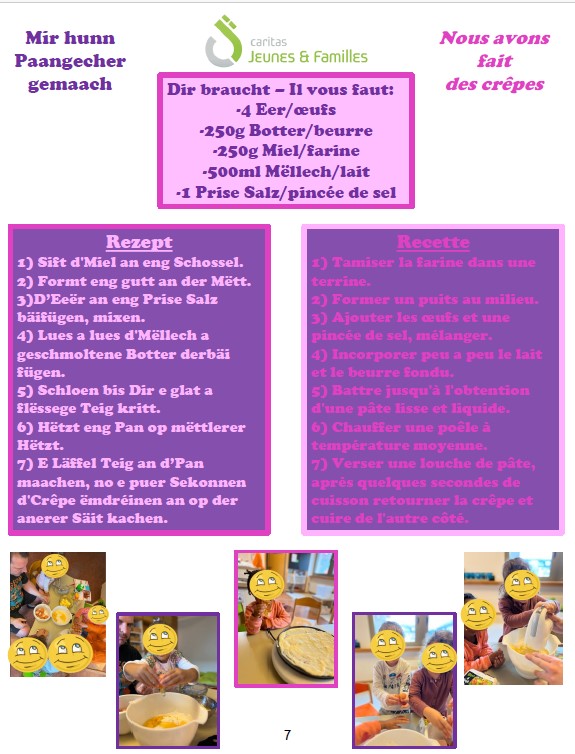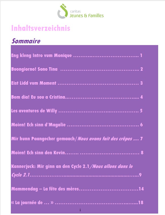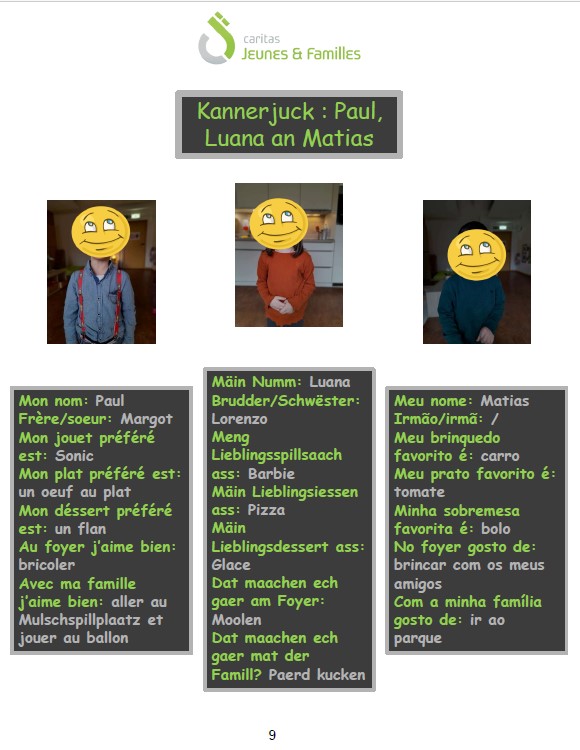 Dans notre crèche nous avons plusieurs nationalités et cultures qui se rencontrent. C’est une des raisons pour laquelle nous avons choisi de créer notre journal « Buggi News ». Nous voulions, d’un côté, donner un aperçu aux parents de notre quotidien à la crèche, de notre identité en tant que crèche, et d’un autre côté, montrer notre identité en tant qu’individus, que ce soit les membres du personnels ou les enfants. Le plurilinguisme a une place fondamentale dans notre crèche et il était donc important pour nous de le mettre en évidence dans notre journal. C’est pour cette raison que nous avons intégré des interviews dans plusieurs langues, souvent la langue maternelle de l’enfant ou du membre du personnel, des chansons dans des différentes langues, ainsi que des recettes que nous avons réalisé avec les enfants en français et en luxembourgeois.