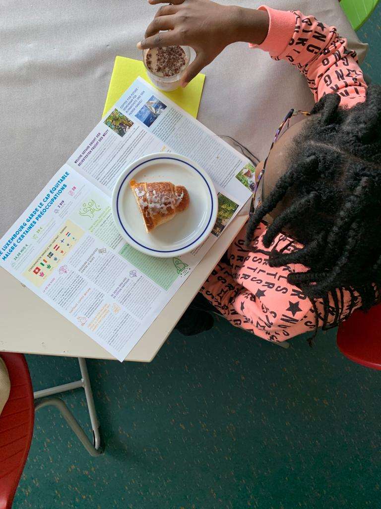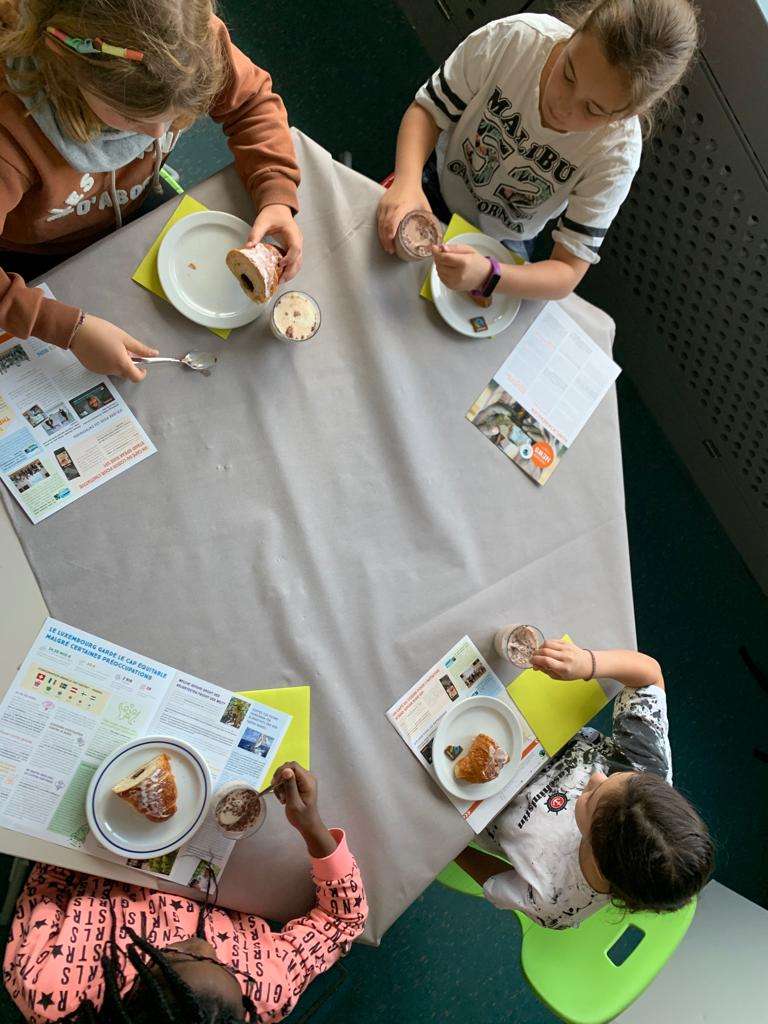 – In den zwei Wochen kommen externe Experten von Fairtrade.lu, die verschiedene Workshops für Cycle 3-4 (Anzahl 15K., Alter 8-12J) anbieten und mit den Kindern durchführen. Die Erzieher vom Cycle 1-2 (Anzahl 16K., Alter 5-7J.) erarbeiten verschiedene Aktivitäten zum Thema (Besuch bei einem Fairtrade Händler, Backaktivität, usw.) Die Erzieher der MR bieten eine Woche lang jeden Morgen ein ausgewogenes/gesundes Fairtrade Frühstück an. Die einzelnen Schulklassen können sich anhand einer von uns ausgeteilten Liste, für einen Morgen anmelden. Es wird über einzelne Produkte während dem Frühstück gesprochen. Kinder können ihre bisherigen Erfahrungen schildern (Austausch)
