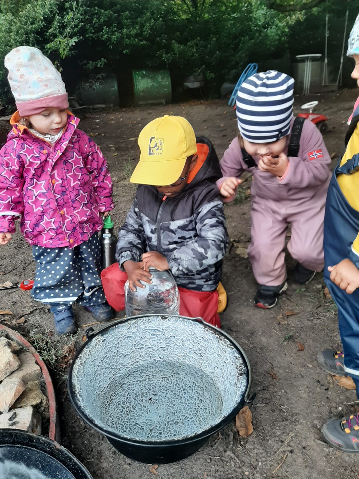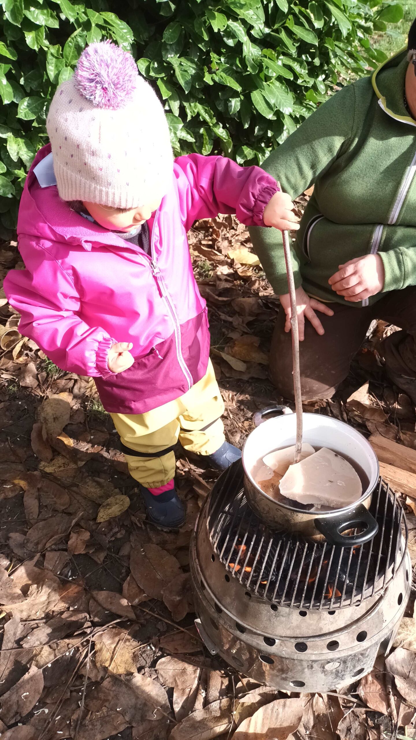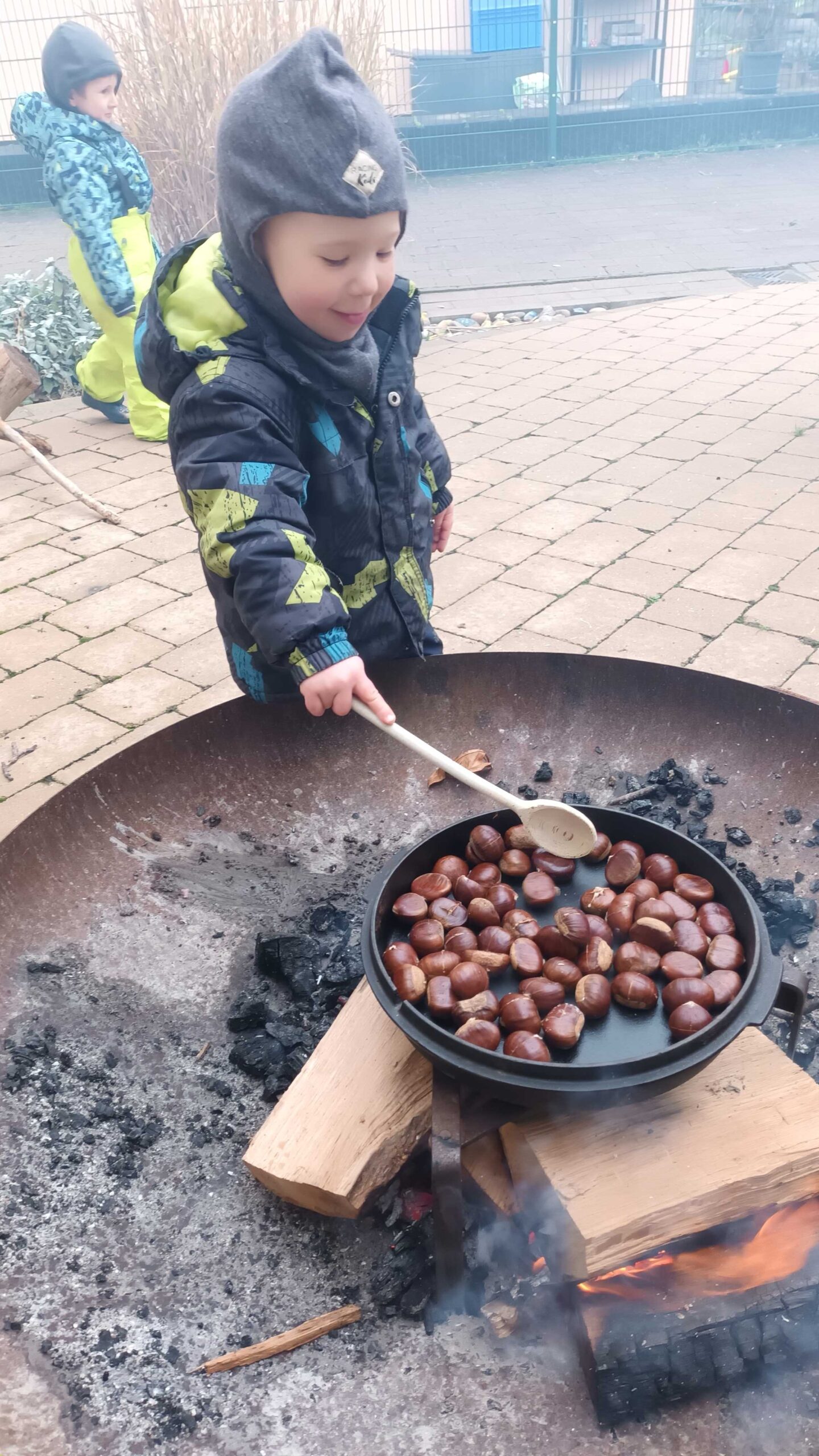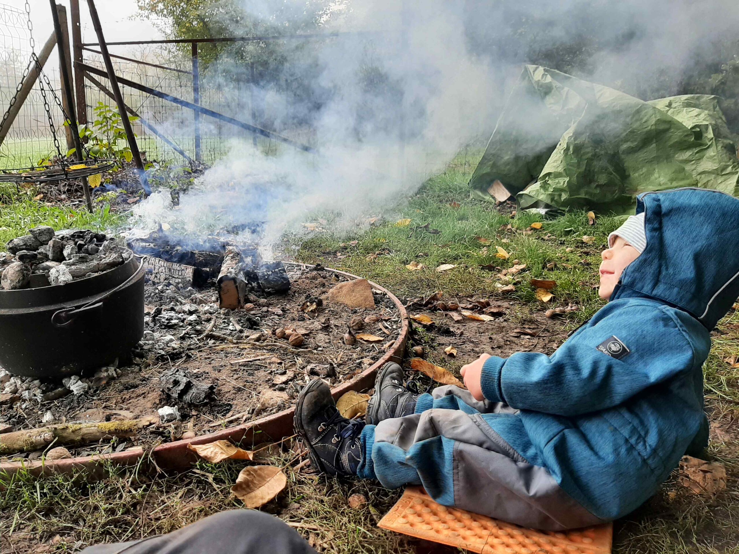 Die Herstellung einer Mahlzeit auf dem Feuer, erfordert viele verschiedene Schritte, wie das Feuer machen, das Vorbereiten der Speisen und das gemeinsame Kochen. Unser Hauptziel besteht darin, dass die Kinder in all diese Prozesse eingebunden werden. Erstmal werden die neuen Kinder auf das Medium Feuer vorbereitet. Dies geschieht indem wir über die Gefahren und Verhaltensregeln beim offenen Feuer reden. Es werden Aktivitäten angeboten, welche mit dem Beschaffen der Materialien ein Feuer zu entfachen, zu tun haben (Äste sammeln, Anzünder aus Kerzenresten herstellen, Material kennenlernen, Holz zur Feuerstelle bringen und hacken). In den ersten Monaten sind die kleineren Kinder Beobachter und lernen von den größeren Kindern. Später können sie auch beim Anzünden des Feuers behilflich sein (Holz auf das Feuer legen). Die Kinder werden in die Vorbereitungen des Essens mit eingebunden. Sie lernen sich an Hygienevorschriften zu halten (Hände waschen und Tisch desinfizieren). Die Kinder schneiden die Zutaten klein, kneten Teig und messen ab. Wenn es zum Kochen am offenen Feuer geht, arbeiten die Kinder jeweils 1 zu 1 mit einem Erzieher, da das Feuer Gefahren mit sich bringt. Den Kindern wird jedoch vermittelt, keine Angst vor dem Feuer zu haben, sondern sich gut an Anweisungen zu halten. Die Feuerküche beruht auf dem Prinzip der Freiwilligkeit und weckt bei vielen Kindern großes Interesse. Sie schult ihre Geduld, fördert kognitive und feinmotorische Fähigkeiten, sowie soziales Engagement. Die Kinder werden dabei ganzheitlich gefördert und lernen ihren Körper besser kennen. Da wir einmal wöchentlich am Feuer kochen, ist das gesamte Projekt an die verschiedenen Jahreszeiten angepasst. Sie erfahren welche Nahrungsmittel wann (saisonal) geerntet werden können. Die Menüs werden im Vorfeld mit den Kindern gewählt, wir achten jedoch auf ausgewogene Gerichte. Sie erlernen einen gesunden Umgang mit der Natur und ihren Ressourcen.