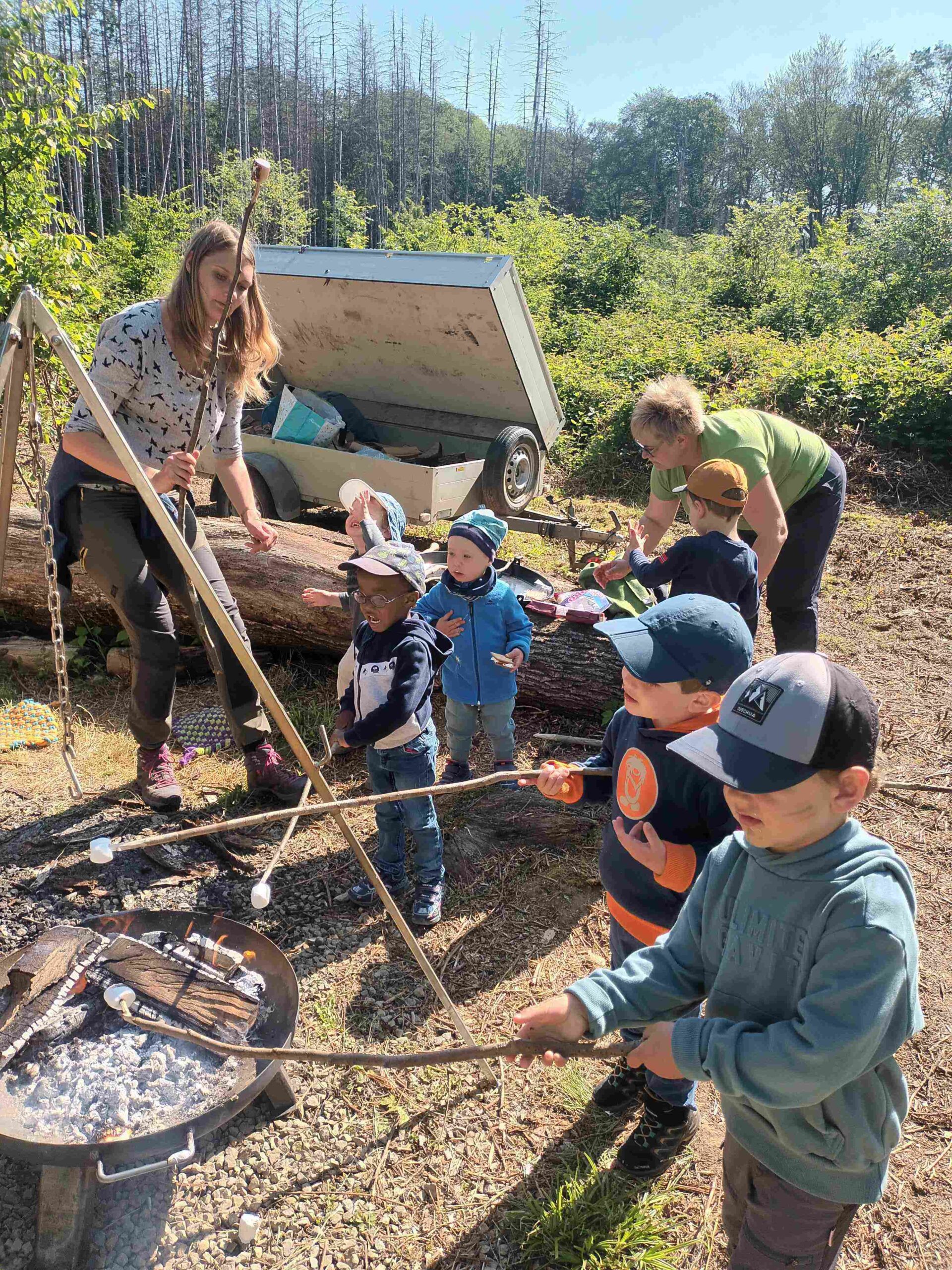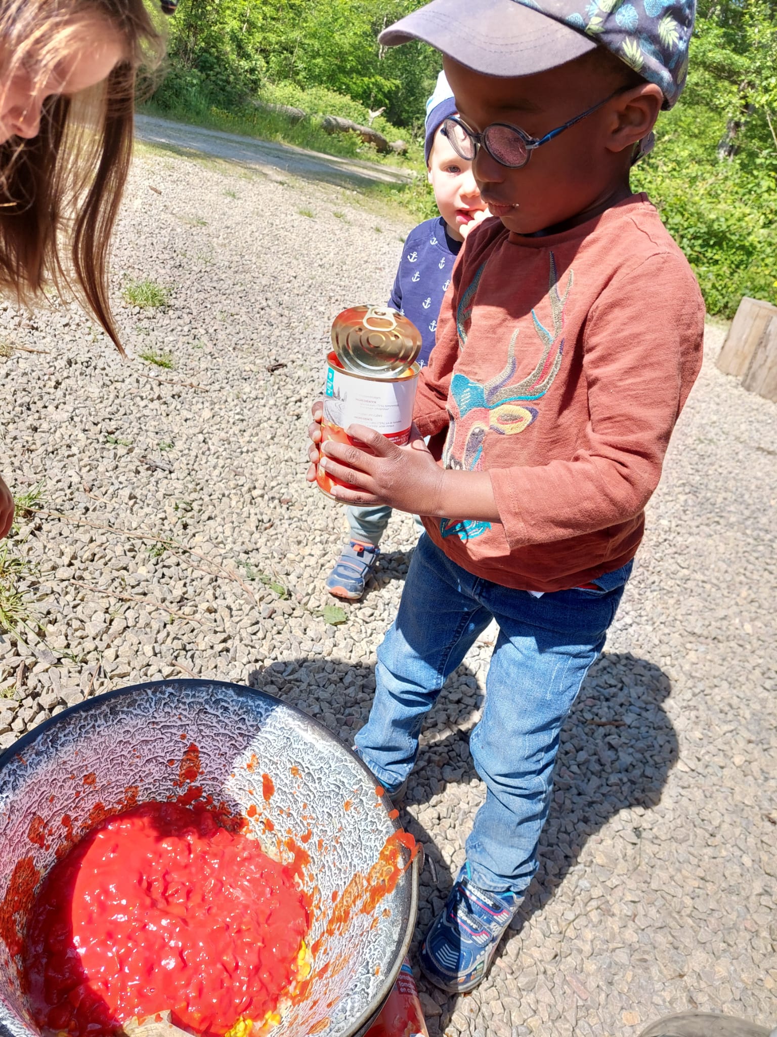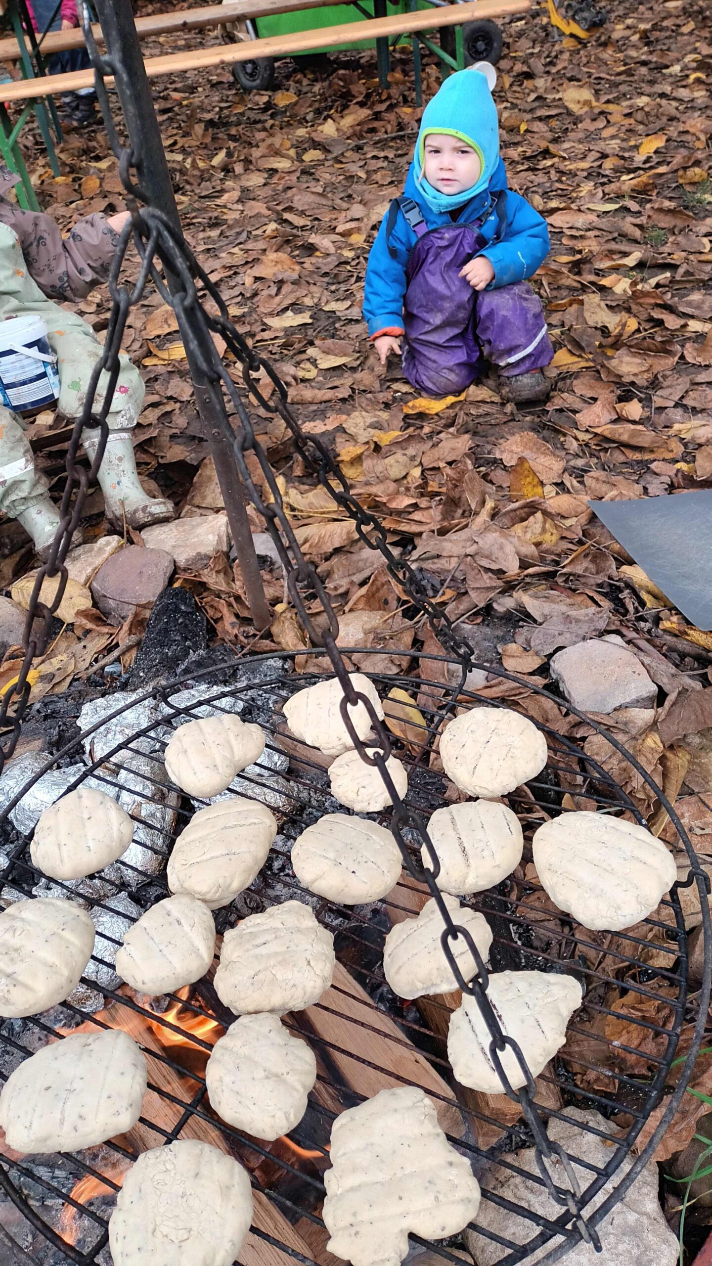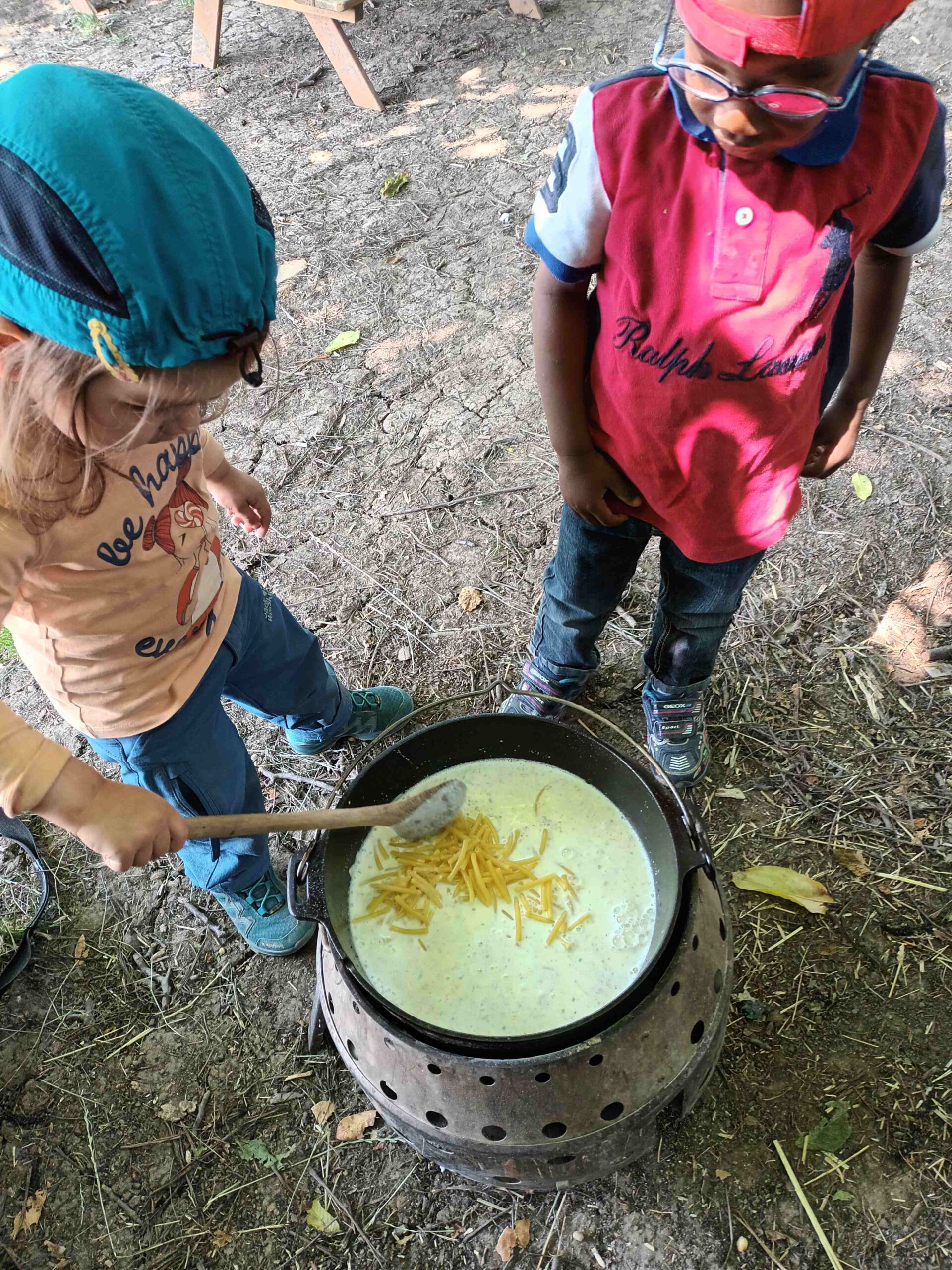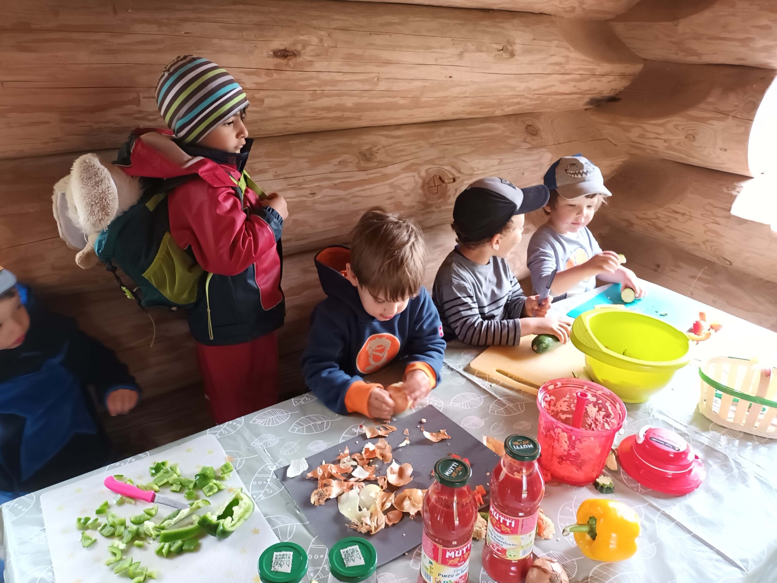 Die Herstellung einer Mahlzeit auf dem Feuer, erfordert viele verschiedene Schritte, wie das Feuer machen, das Vorbereiten der Speisen und das gemeinsame Kochen. Unser Hauptziel besteht darin, dass die Kinder in all diese Prozesse eingebunden werden. Erstmal werden die neuen Kinder auf das Medium Feuer vorbereitet. Dies geschieht indem wir über die Gefahren und Verhaltensregeln beim offenen Feuer reden. Es werden Aktivitäten angeboten, welche mit dem Beschaffen der Materialien ein Feuer zu entfachen, zu tun haben (Äste sammeln, Anzünder aus Kerzenresten herstellen, Material kennenlernen, Holz zur Feuerstelle bringen und hacken). In den ersten Monaten sind die kleineren Kinder Beobachter und lernen von den größeren Kindern. Später können sie auch beim Anzünden des Feuers behilflich sein (Holz auf das Feuer legen). Die Kinder werden in die Vorbereitungen des Essens mit eingebunden. Sie lernen sich an Hygienevorschriften zu halten (Hände waschen und Tisch desinfizieren). Die Kinder schneiden die Zutaten klein, kneten Teig und messen ab. Wenn es zum Kochen am offenen Feuer geht, arbeiten die Kinder jeweils 1 zu 1 mit einem Erzieher, da das Feuer Gefahren mit sich bringt. Den Kindern wird jedoch vermittelt, keine Angst vor dem Feuer zu haben, sondern sich gut an Anweisungen zu halten. Die Feuerküche beruht auf dem Prinzip der Freiwilligkeit und weckt bei vielen Kindern großes Interesse. Sie schult ihre Geduld, fördert kognitive und feinmotorische Fähigkeiten, sowie soziales Engagement. Die Kinder werden dabei ganzheitlich gefördert und lernen ihren Körper besser kennen. Da wir einmal wöchentlich am Feuer kochen, ist das gesamte Projekt an die verschiedenen Jahreszeiten angepasst. Sie erfahren welche Nahrungsmittel wann (saisonal) geerntet werden können. Die Menüs werden im Vorfeld mit den Kindern gewählt, wir achten jedoch auf ausgewogene Gerichte. Sie erlernen einen gesunden Umgang mit der Natur und ihren Ressourcen.