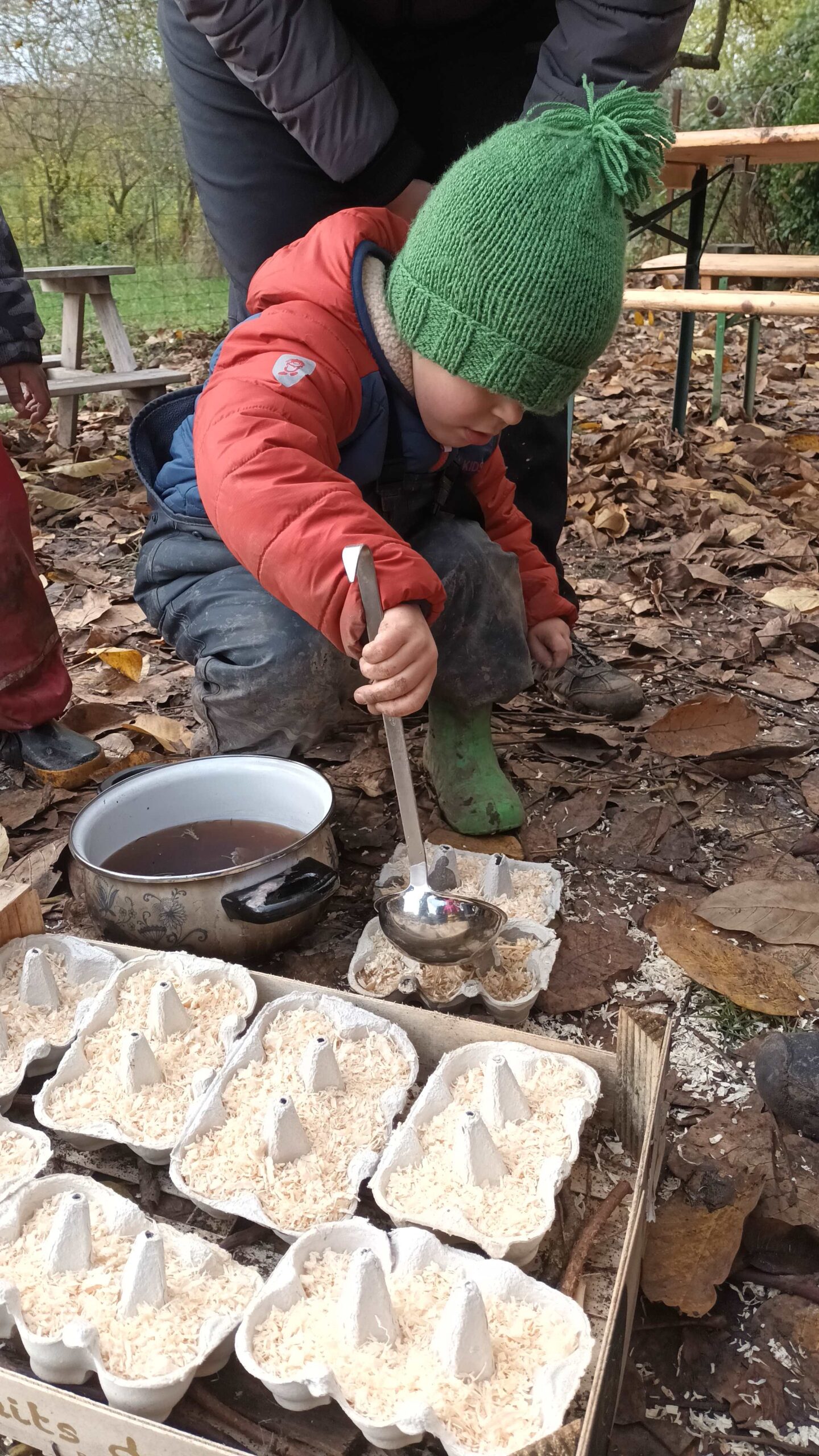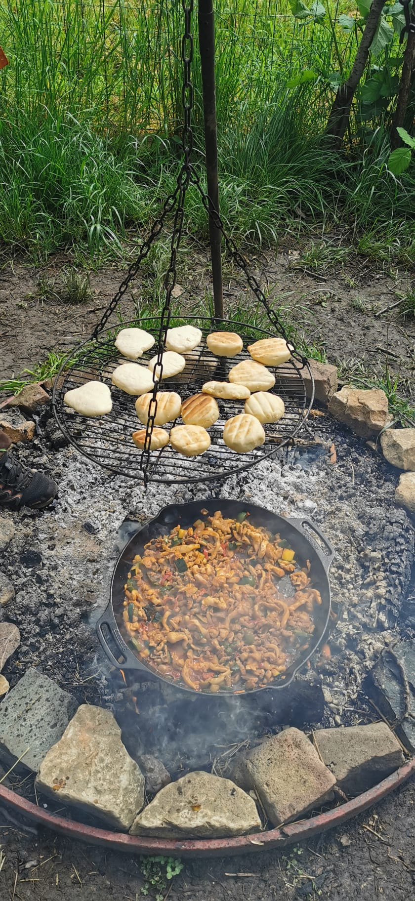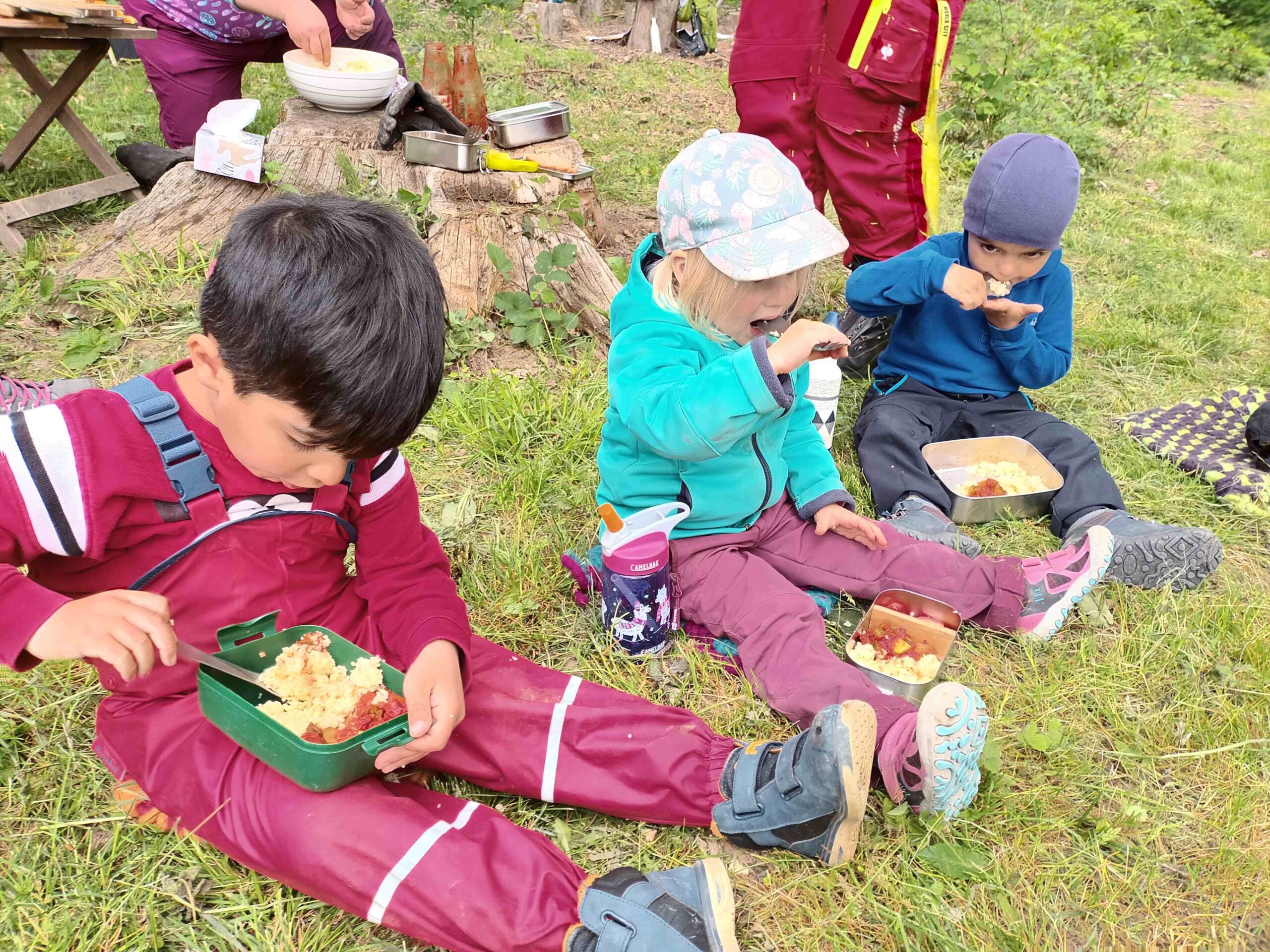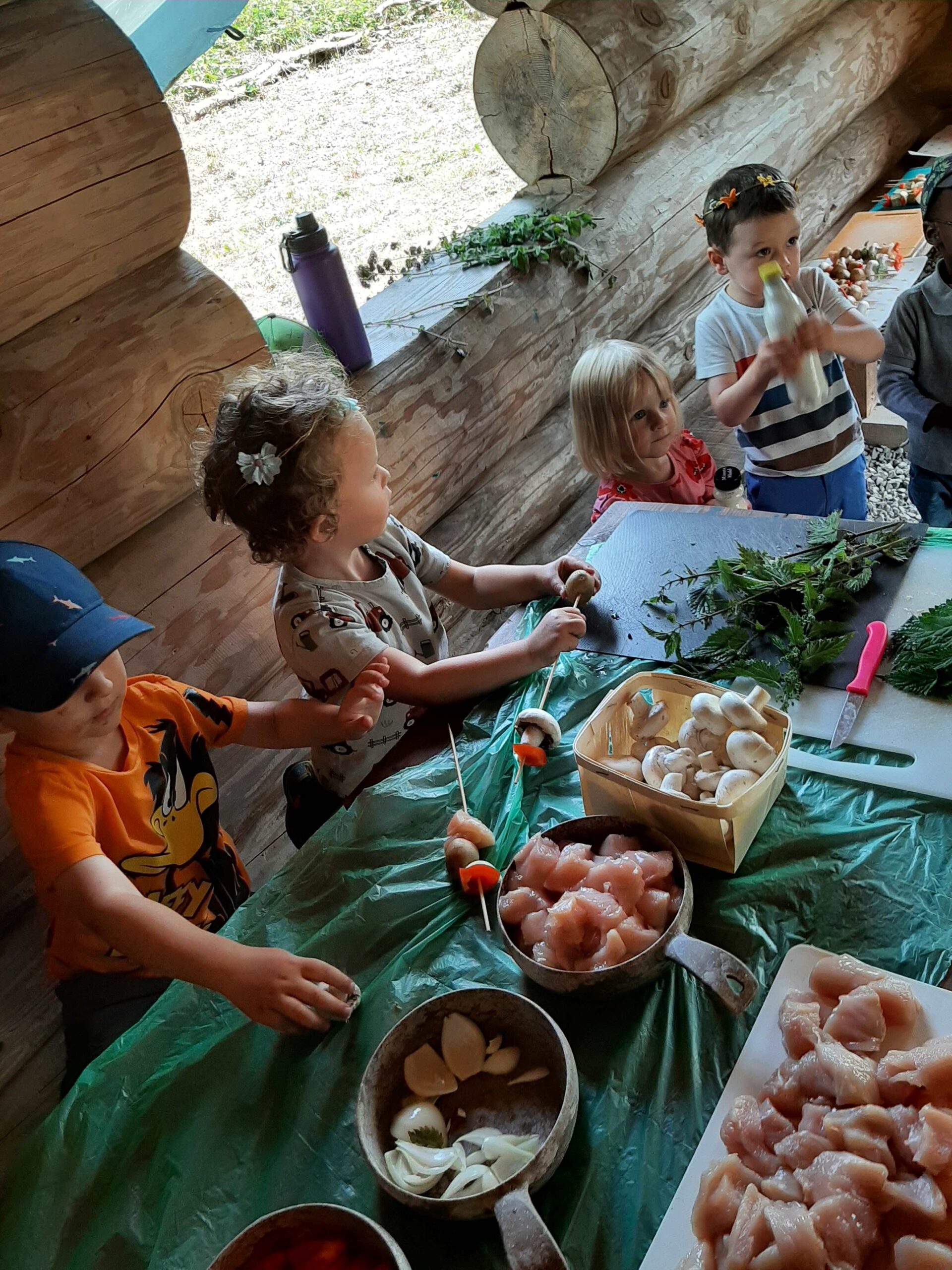 Die Herstellung einer Mahlzeit auf dem Feuer, erfordert viele verschiedene Schritte, wie das Feuer machen, das Vorbereiten der Speisen und das gemeinsame Kochen. Unser Hauptziel besteht darin, dass die Kinder in all diese Prozesse eingebunden werden. Erstmal werden die neuen Kinder auf das Medium Feuer vorbereitet. Dies geschieht indem wir über die Gefahren und Verhaltensregeln beim offenen Feuer reden. Es werden Aktivitäten angeboten, welche mit dem Beschaffen der Materialien ein Feuer zu entfachen, zu tun haben (Äste sammeln, Anzünder aus Kerzenresten herstellen, Material kennenlernen, Holz zur Feuerstelle bringen und hacken). In den ersten Monaten sind die kleineren Kinder Beobachter und lernen von den größeren Kindern. Später können sie auch beim Anzünden des Feuers behilflich sein (Holz auf das Feuer legen). Die Kinder werden in die Vorbereitungen des Essens mit eingebunden. Sie lernen sich an Hygienevorschriften zu halten (Hände waschen und Tisch desinfizieren). Die Kinder schneiden die Zutaten klein, kneten Teig und messen ab. Wenn es zum Kochen am offenen Feuer geht, arbeiten die Kinder jeweils 1 zu 1 mit einem Erzieher, da das Feuer Gefahren mit sich bringt. Den Kindern wird jedoch vermittelt, keine Angst vor dem Feuer zu haben, sondern sich gut an Anweisungen zu halten. Die Feuerküche beruht auf dem Prinzip der Freiwilligkeit und weckt bei vielen Kindern großes Interesse. Sie schult ihre Geduld, fördert kognitive und feinmotorische Fähigkeiten, sowie soziales Engagement. Die Kinder werden dabei ganzheitlich gefördert und lernen ihren Körper besser kennen. Da wir einmal wöchentlich am Feuer kochen, ist das gesamte Projekt an die verschiedenen Jahreszeiten angepasst. Sie erfahren welche Nahrungsmittel wann (saisonal) geerntet werden können. Die Menüs werden im Vorfeld mit den Kindern gewählt, wir achten jedoch auf ausgewogene Gerichte. Sie erlernen einen gesunden Umgang mit der Natur und ihren Ressourcen.