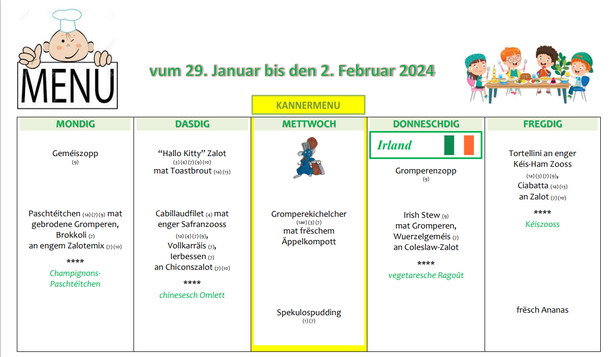 Op enger Hospitatioun hunn eis pädagogesch Fachkräft Beispiller gesinn, wou d’Kanner mat bei der Menügestaltung konnten deelhuelen. Doraus hunn mir d’Iddie mat an eis d’Haus geholl, fir och méi op d’Partizipatioun an Opklärung am Bezuch op d’Iesssituatiounen an ze goen. Mir hunn den 01/02/2023 mat dem Projet Kannermenü zu Wëntger gestart. Bis den Juli 2023 war den Projet just fir den Cycle 1 bis 4, zanter September 2023 ass och den Précoce mat dobäi. All Cycle huet sech Gedanken gemeet wéi mir dëst Thema mat den Kanner uginn, wéi mir si sensibiliséieren, wat wichteg ass beim Eraussichen vum Menü an fir den Projet ze starten goufen dem Alter ugepasst Aktivitéiten dozou gemaach: Quiz, Ernährungspyramide, Kimspiller mat Statiounen, .. . Natierlech huet och missten een Logo hier fir d’Menü ze kennzeechnen, also hunn d’Kanner aus dem Cycle 2-4 een Logo entworf. Mëttlerweil gëtt et all Mëttwoch e Kannermenü. Dëst gëtt ofwiesselend vum Précoce, Cycle 1 an dem Cycle 2-4 decidéiert. Dat sinn 80 Kanner Den Kanner gëtt erkläert, dass et pro Woch verschidden Kategorien vum Iessen soll ginn (1x Fësch; 1-2x Vegetaresch; 1x Gefligel; 2x Fleesch; 2x Dessert; max. all 14 Deeg eppes fritéiertes..). Deemno hunn d’Kanner och fir hier Woch een entspriechenden Kader, aus dem si d’Menü kënnen zesummen setzen. D’Kanner kréien verschidden reell Biller gewisen fir iwwert d’Menü ofzestëmmen: – Beim Précoce an dem Cycle 1 visualiséieren mir d’Ofstëmmung duerch Legosstécker, déi als Tierm opgebaut ginn. Den héichsten Tuerm huet gewonn. – Beim Cycle 2-4 gëtt iwwer Diskussiounen an mat Stréchlëschten ofgestëmmt (10Kanner) Den fäerdegen Menü gëtt op engem Blat notéiert oder opgemoolt an d’Kanner bréngen den Menü selwer an d’Kichen fir dëst den Käch matzedeelen. All Mëttwochs gëtt den Kannermenü op enger extra Tafel ausgestallt, soudass jiddereen gesinn kann wat et haut gëtt. Och um Internetsite ass den Kannermenü gekennzeechent. Den Kannermenü gëtt an Kooperatioun mat eisen Käch, der Infirmière, den Kanner an den pädagogeschen Fachkräft gemaach. D’Kanner sinn all Woch ganz houfereg fir den Menü. Den Projet Kannermenü ass lo well e festen Bestanddeel an eiser Maison Relais.