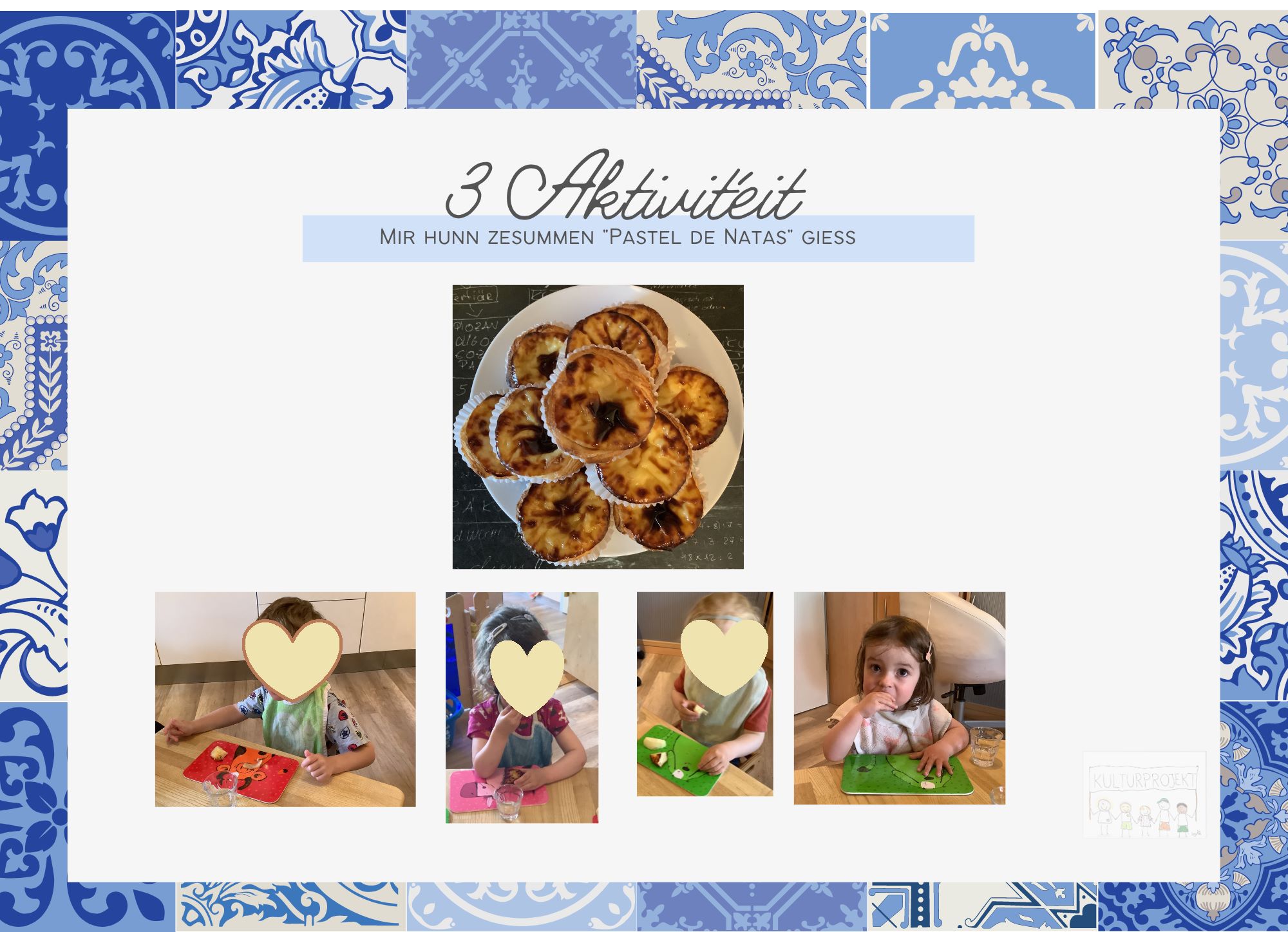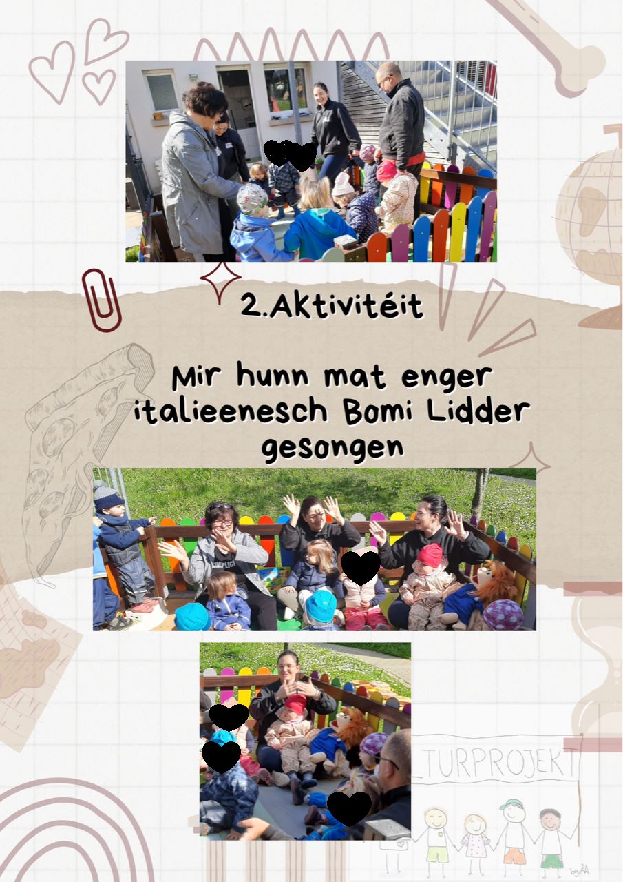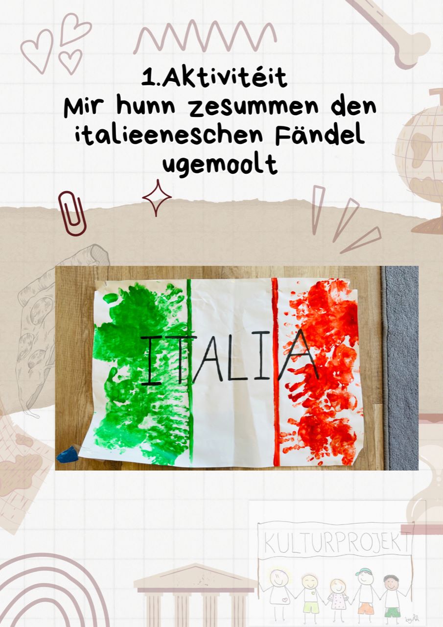 Im Rahmen unseres Kulturprojekts reisen wir monatlich in die verschiedenen Herkunftsländer d. Kinder & gestalten dazu in Zusammenarbeit mit den Eltern & dem Koch verschiedene Aktivitäten. Die Muttersprache der Kinder ist ein Teil ihrer Identität, weshalb wir sie damit valorisieren möchten. Zu dem jeweiligen Land begleiten uns Geschichten, Lieder, Tänze, Spiele, Bastelarbeiten, kulinarische Gerichte & Ideen der Eltern, die mit einfließen. Unser Kulturprojekt lädt dazu ein, die Sprachen der Kinder aufzugreifen & zu erweitern.