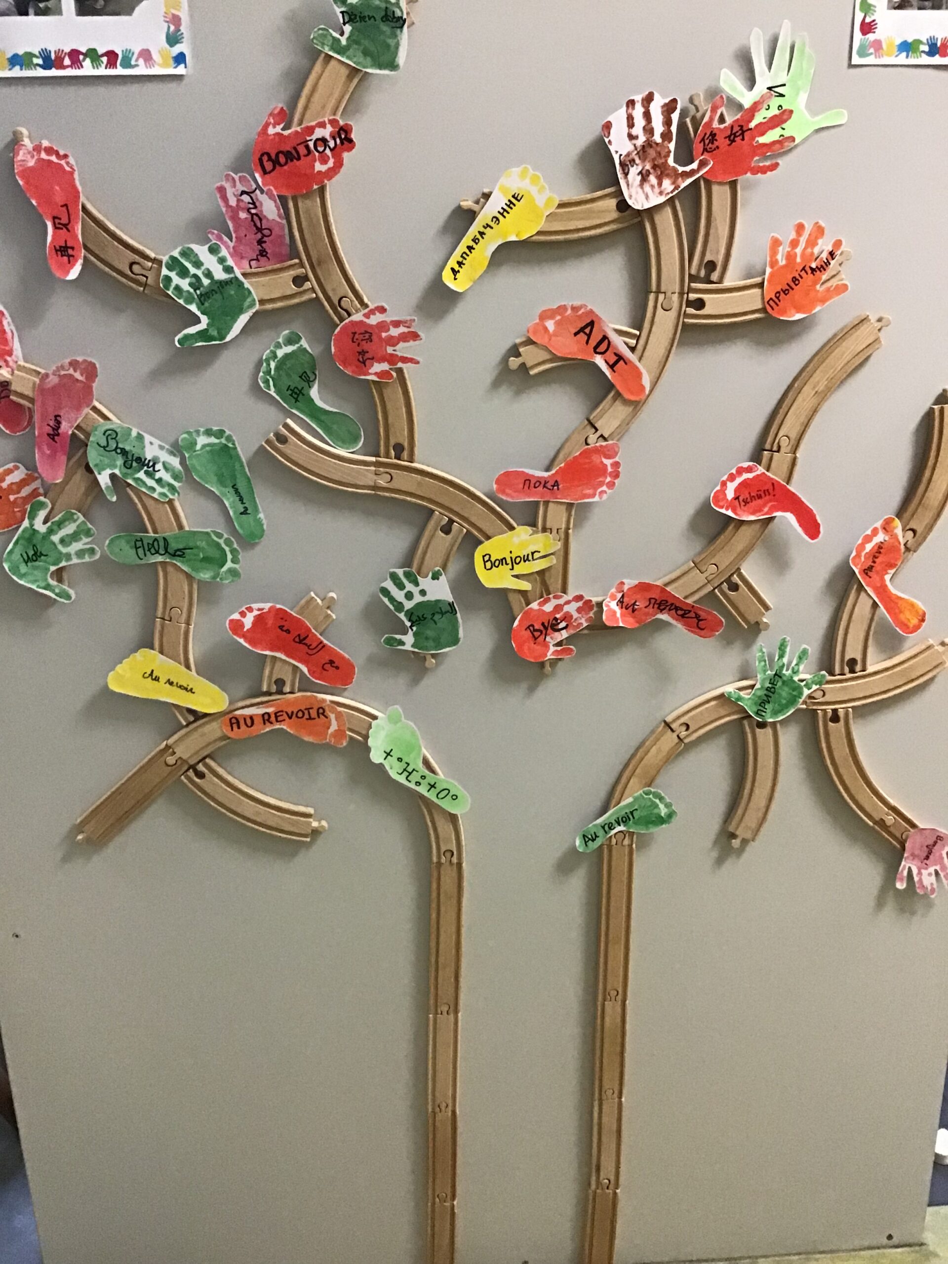 Une fois les empreintes découpées, nous avons proposé à chaque parent de contribuer en écrivant le bonjour et le aurevoir dans leur langue maternelle.