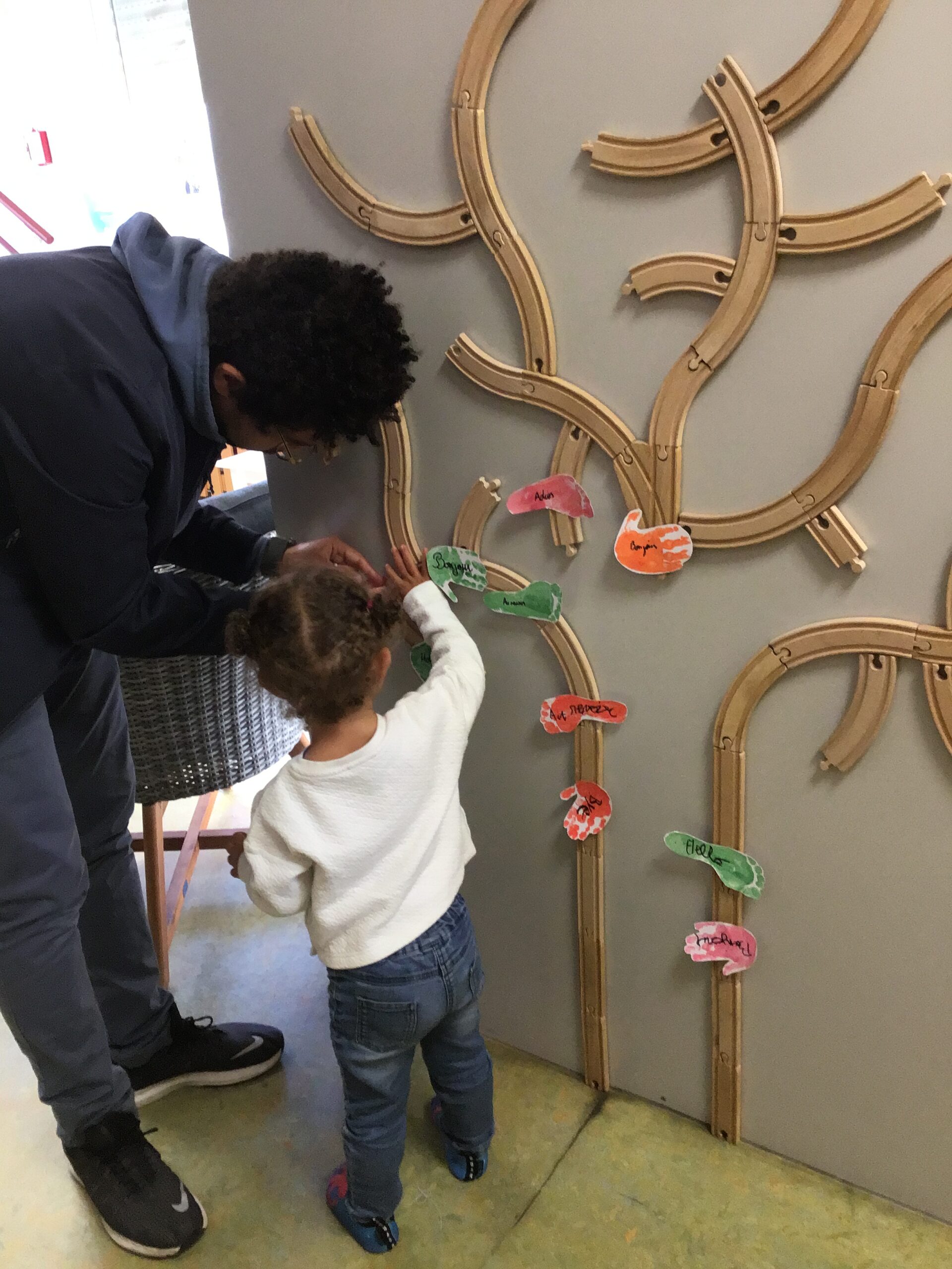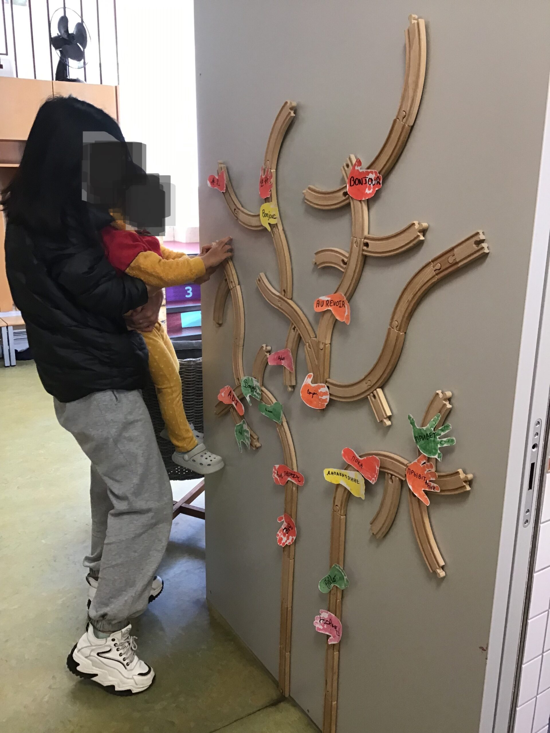 Au préalable les enfants ont réalisé leurs empreintes des mains et des pieds en peinture. Ceux-ci allaient constituer les feuilles de notre arbre. Nous avons utilisé des rails de train en bois pour constituer le tronc.
