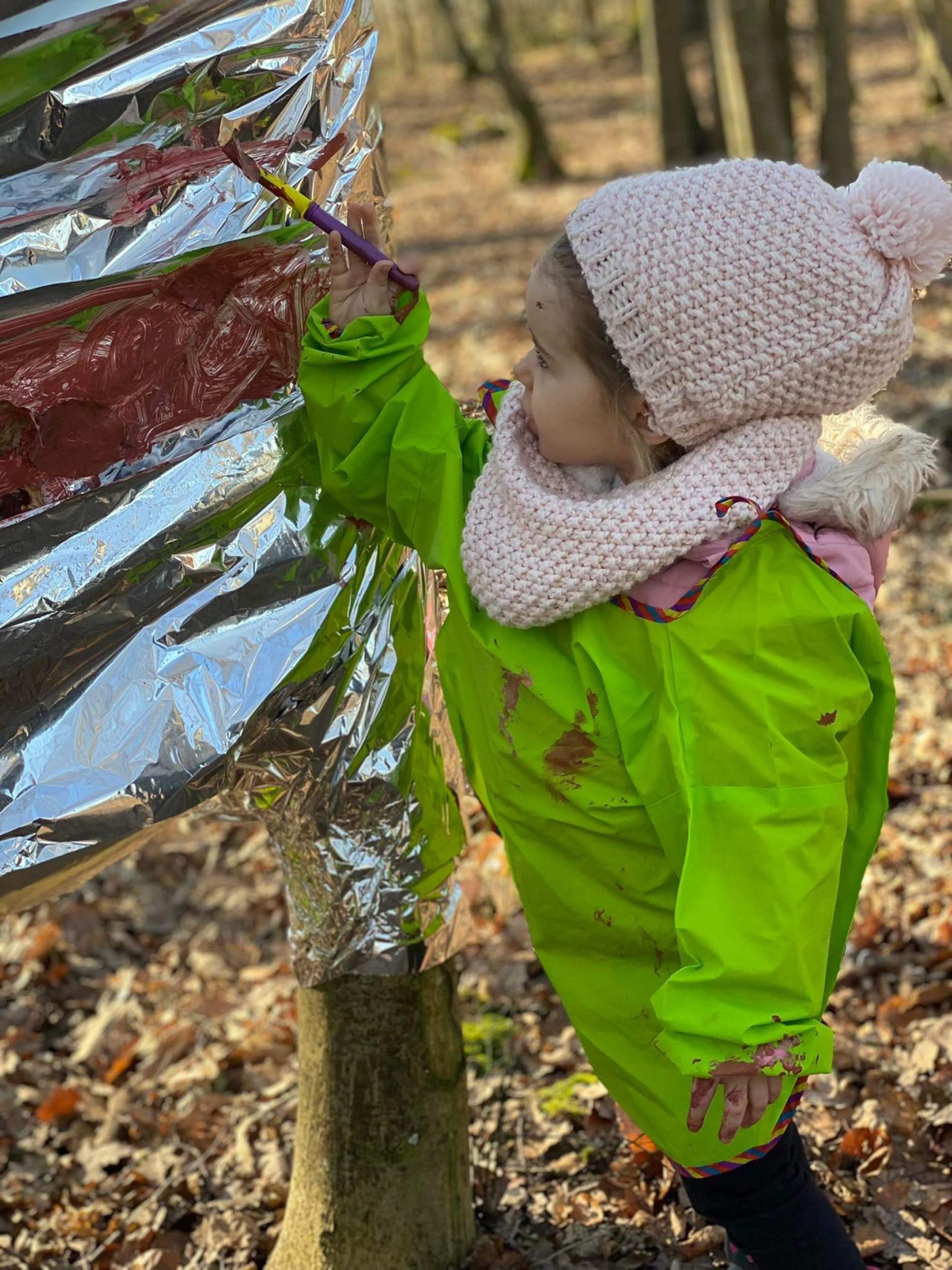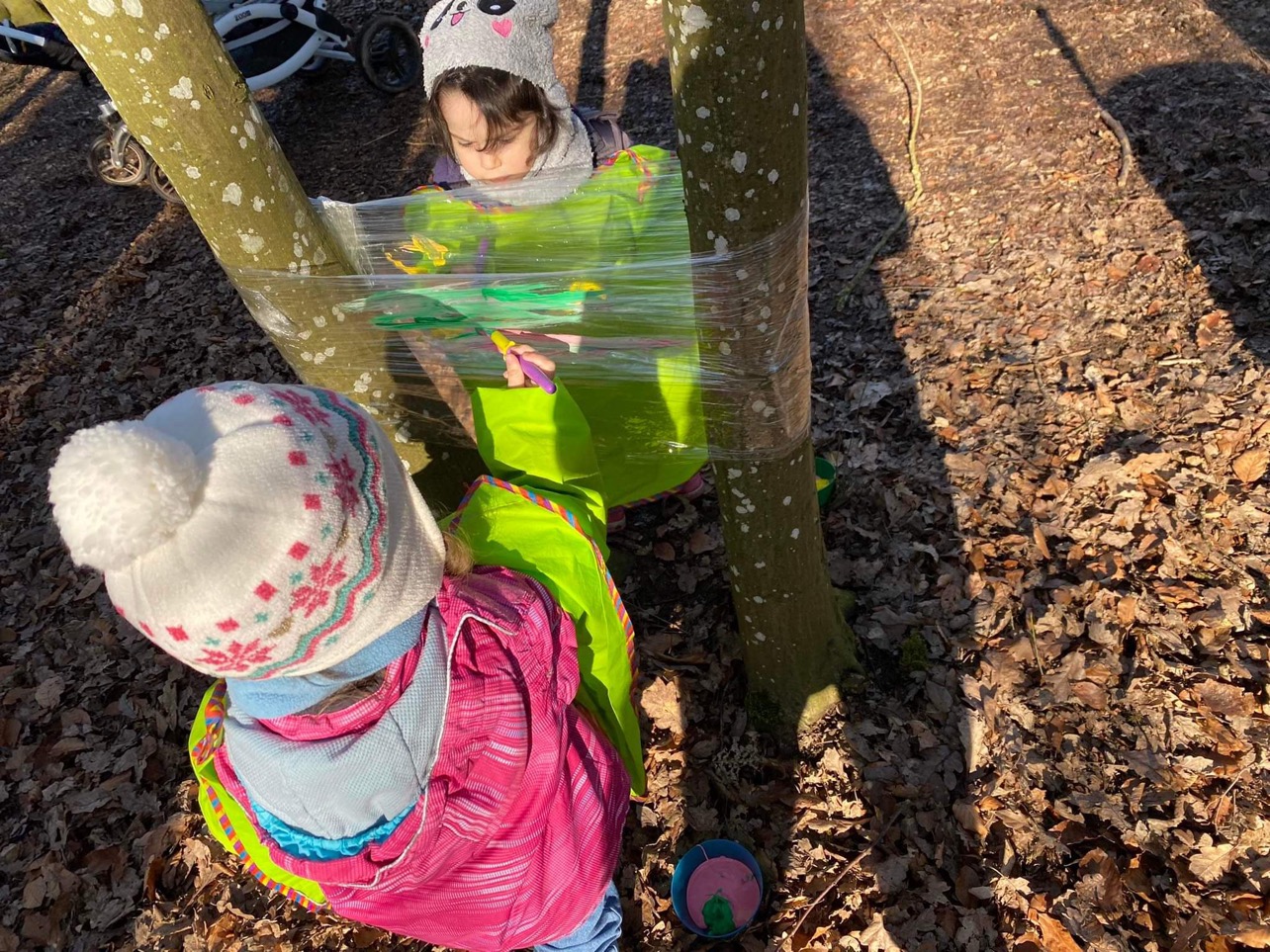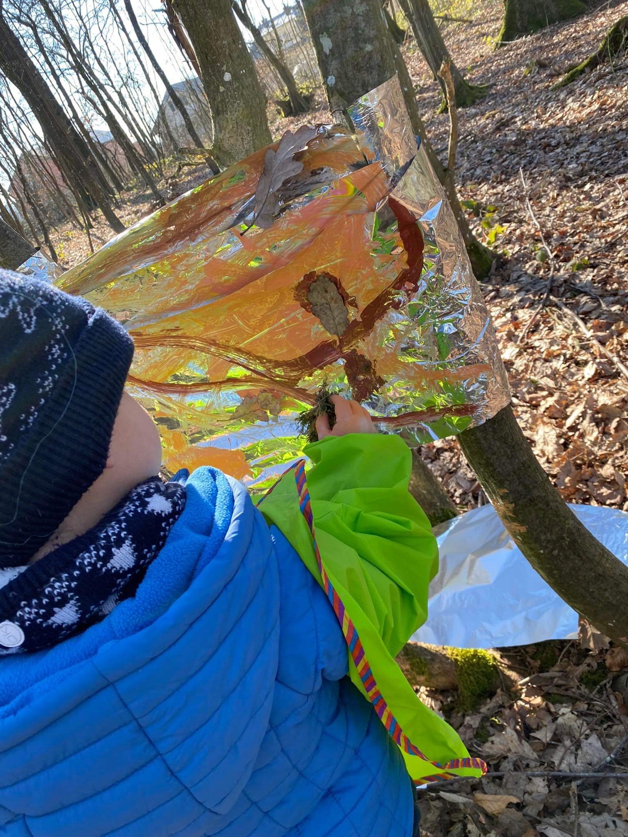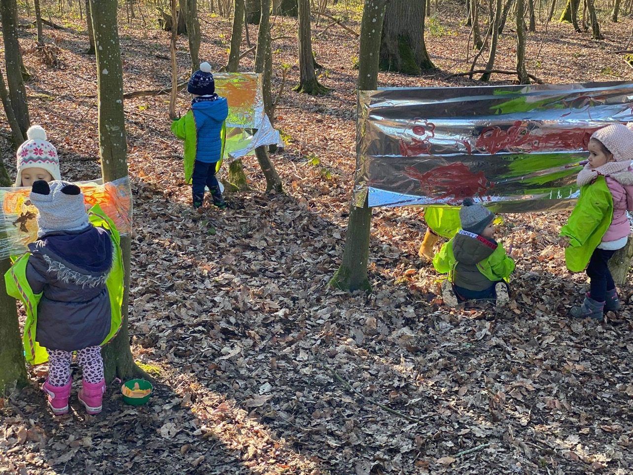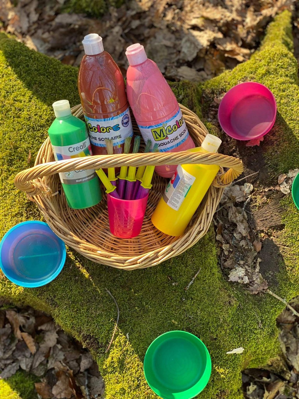 Dans notre projet, nous avons proposé aux enfants de la peinture en forêt ou dehors avec différents matériaux ( gants de peinture ou pinceaux sur film alimentaire disposé entre les arbres). Nous avons également proposé aux enfants lors de nos sorties en forêt des créations avec les éléments de la nature (construction arbres). Nous avons également proposé aux enfants lors de nos sorties en forêt des créations avec les éléments de la nature ( construction d’une cabane pour les hérissons, créations avec des feuilles….)