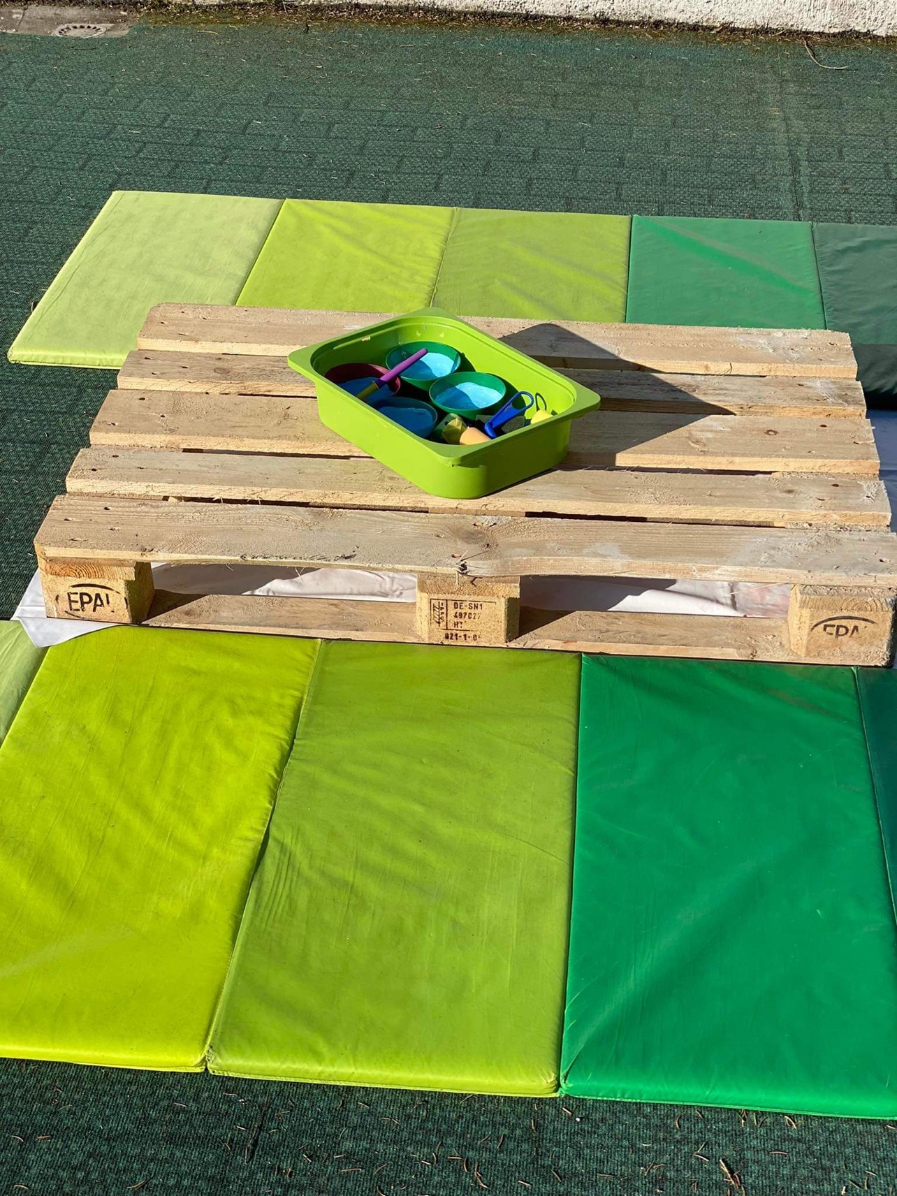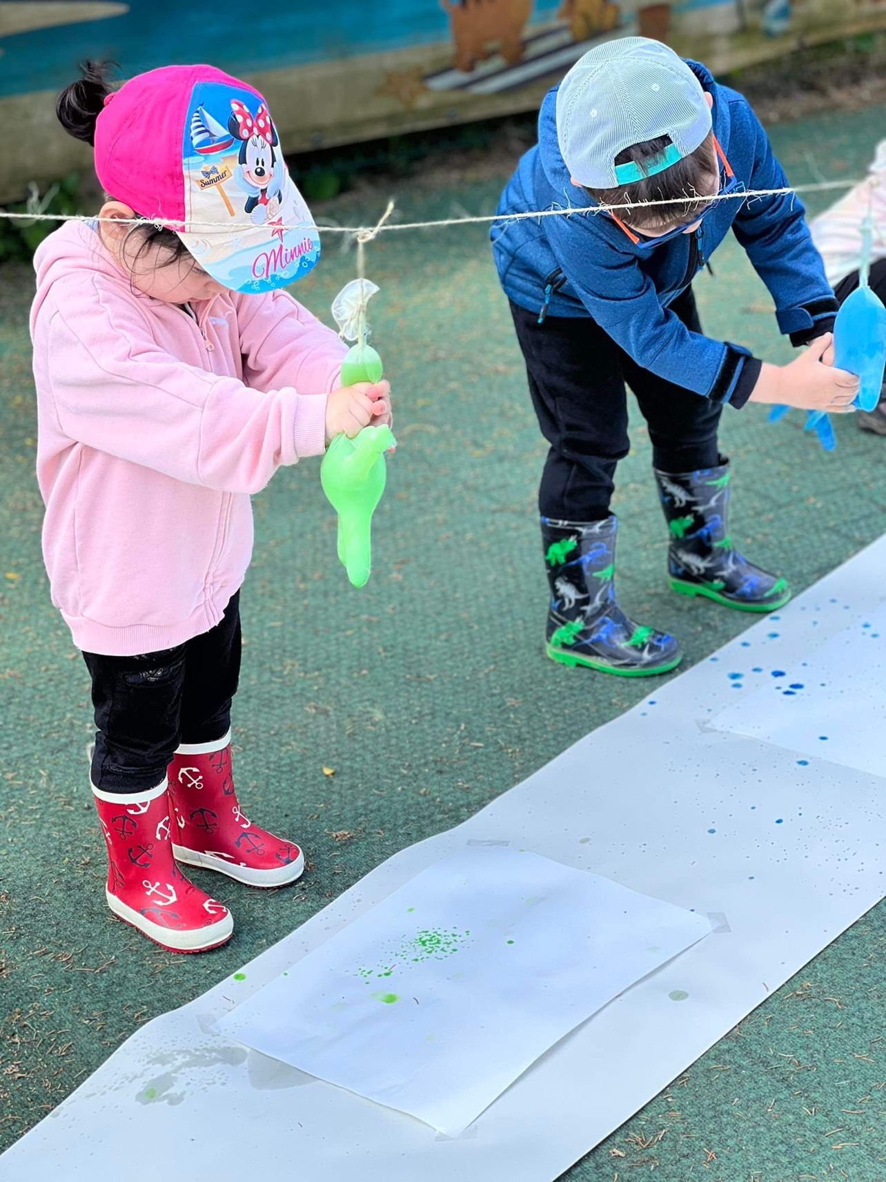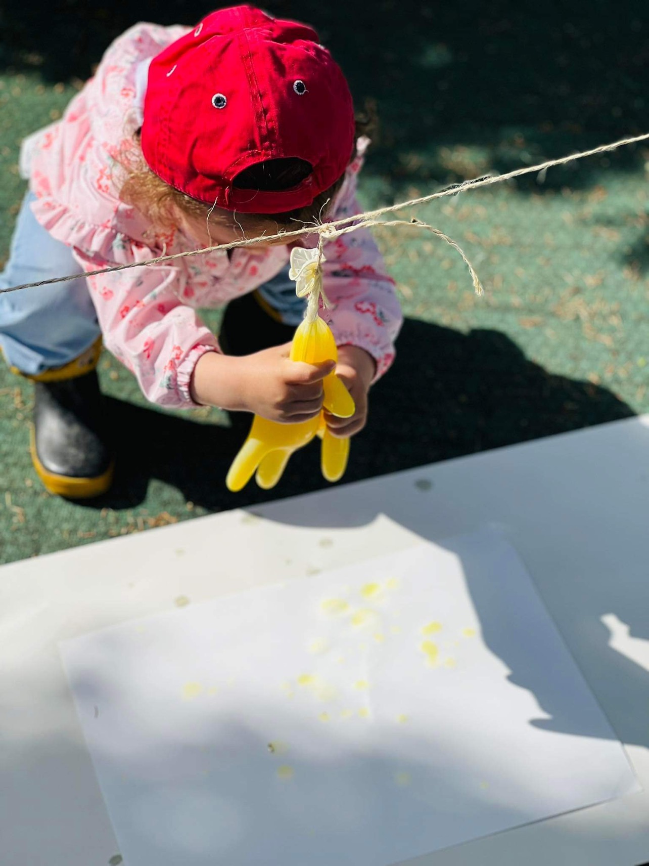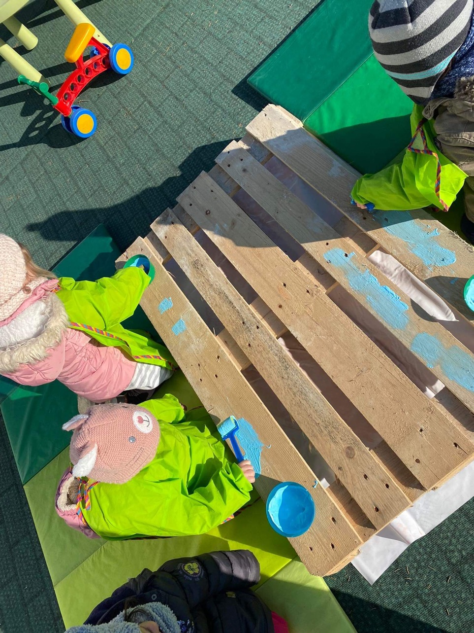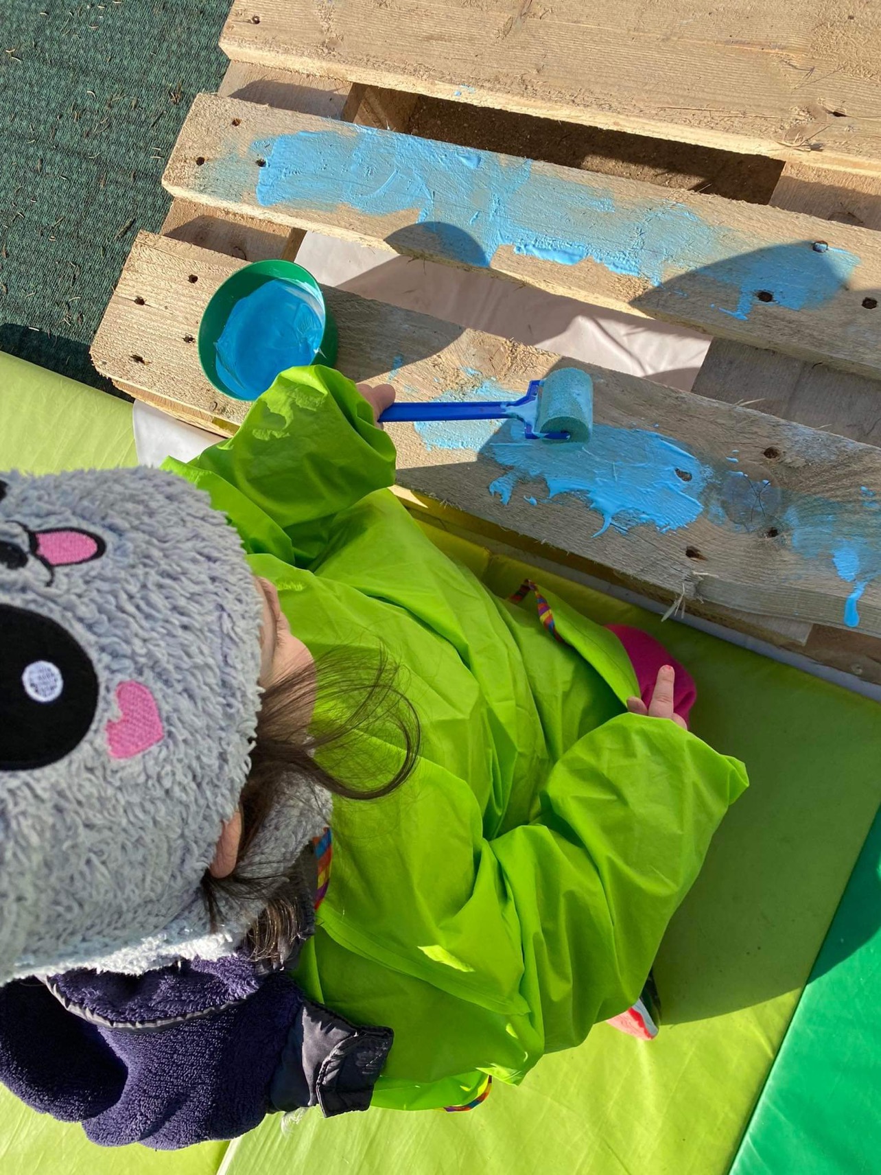 Dans notre projet, nous avons proposé aux enfants de la peinture en forêt ou dehors avec différents matériaux ( gants de peinture ou pinceaux sur film alimentaire disposé entre les arbres). Nous avons également proposé aux enfants lors de nos sorties en forêt des créations avec les éléments de la nature (construction arbres). Nous avons également proposé aux enfants lors de nos sorties en forêt des créations avec les éléments de la nature ( construction d’une cabane pour les hérissons, créations avec des feuilles….)