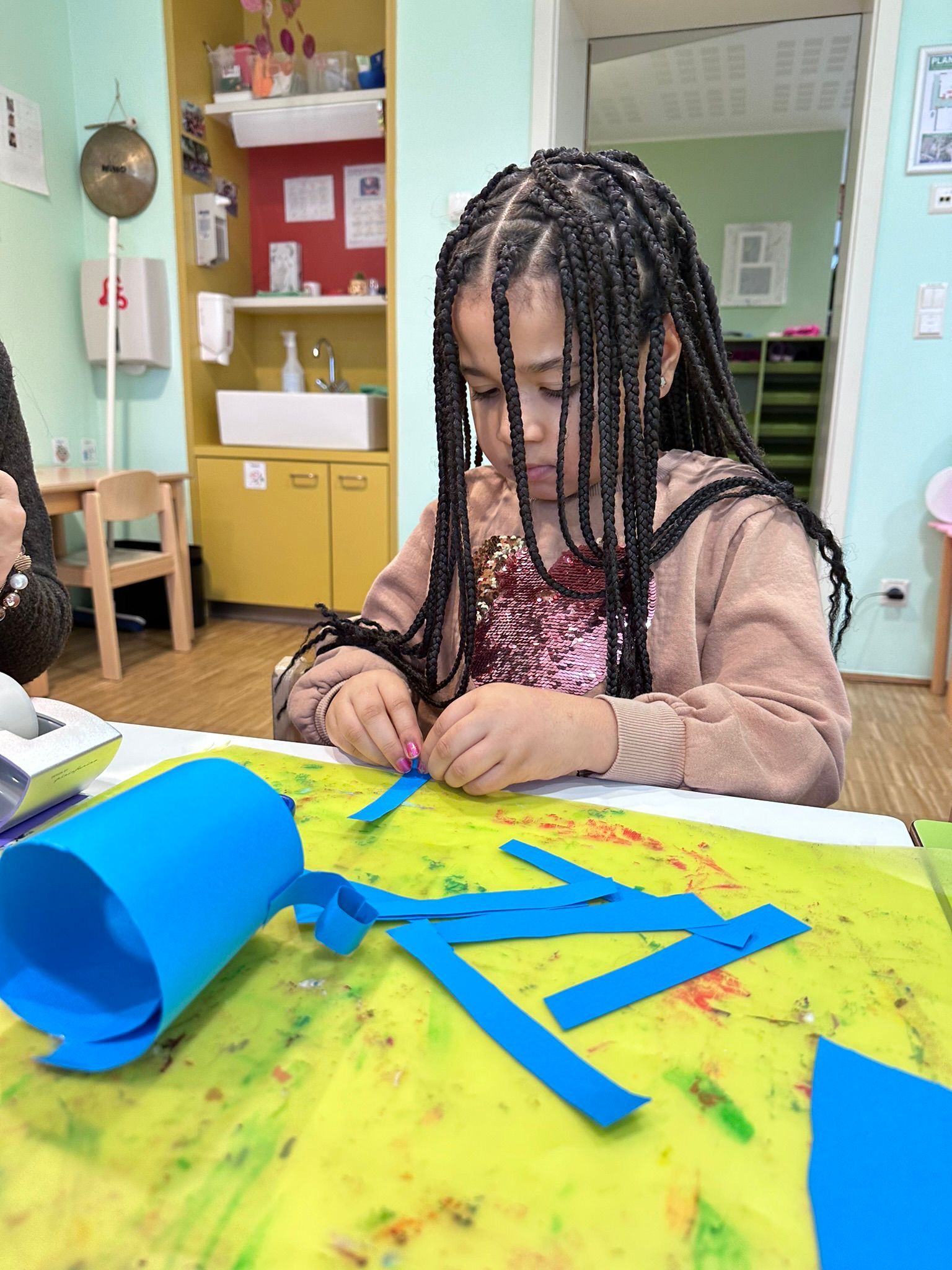 Ensuite nous avons décidé de prêter la boîte à chaque famille côtoyant l’enfant atteint de spectre autistique. Le but était que chaque famille ait la possibilité de se familiariser avec la thématique et de prendre contact avec l’équipe éducative en cas de doutes ou de questions. Chaque famille avait ensuite la possibilité de prendre une photo de son enfant ou de sa famille qu’elle pouvait glisser dans la boite de l’activité qui lui avait plu le plus. Une fois la boîte retournée, les photos des enfants étaient collées sur un grand soleil coloré affiché dans le couloir du SEA où les enfants sont récupérés par leurs parents.