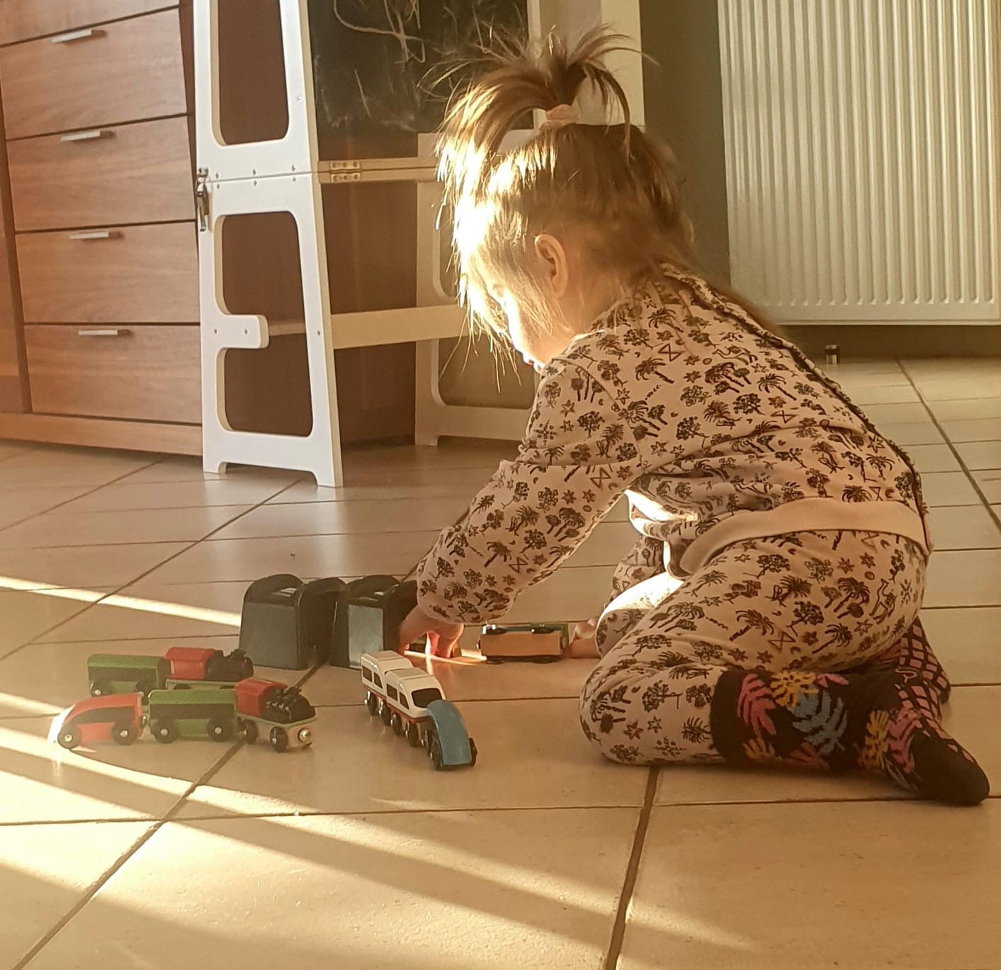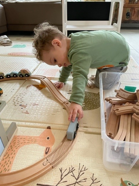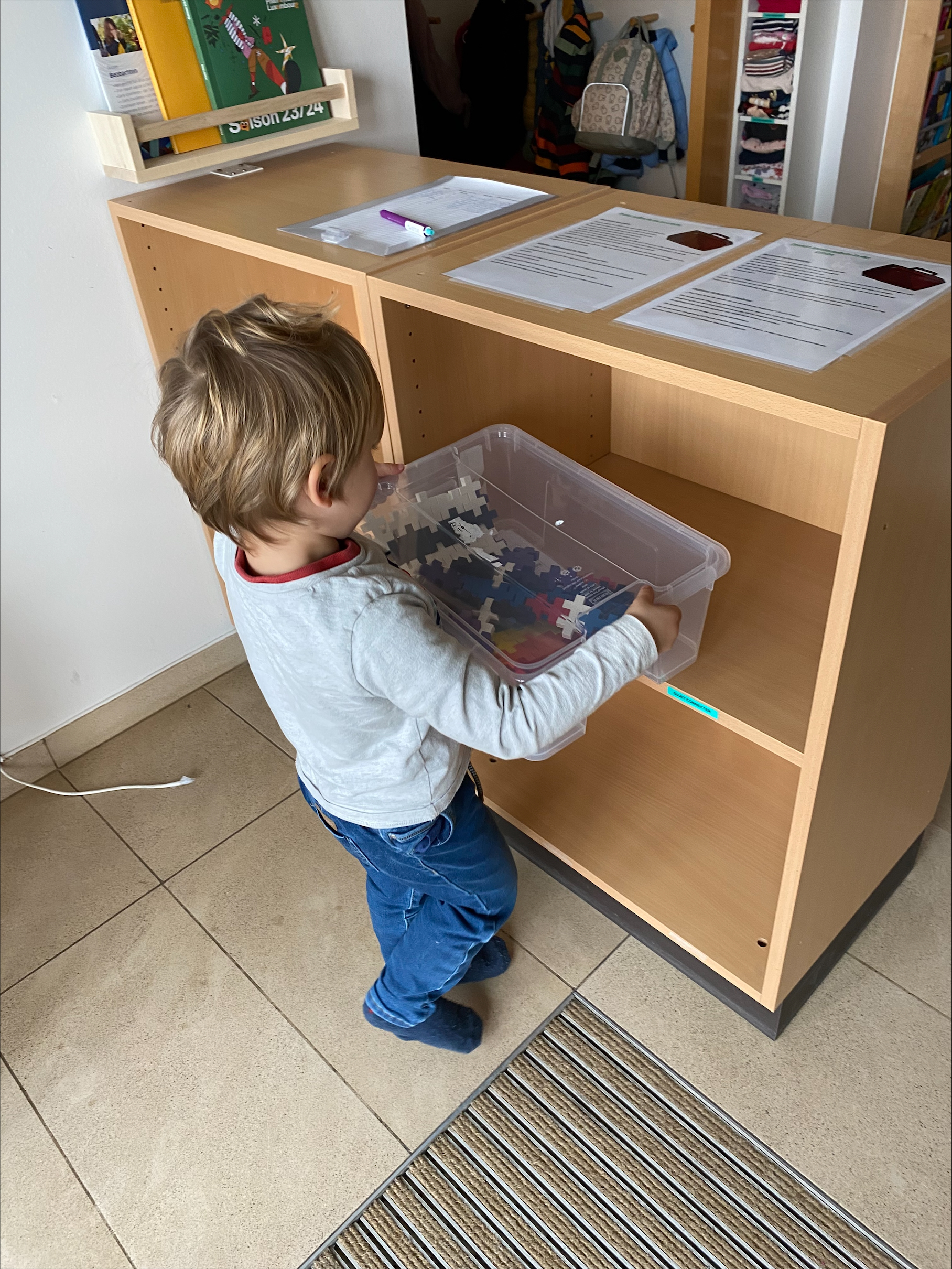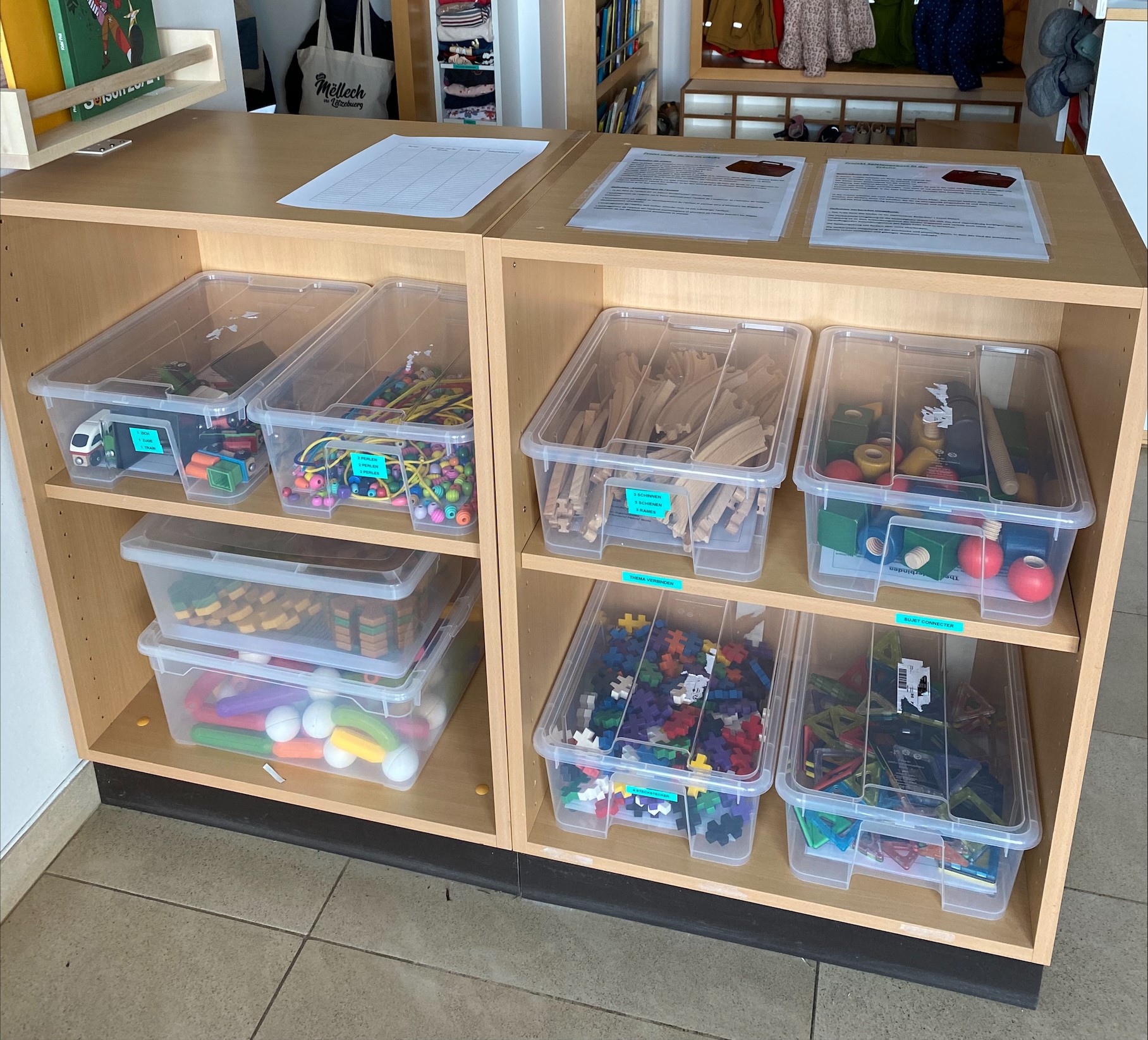 Durch dieses Projekt haben die Eltern die Möglichkeit pädagogisches Spielmaterial ausleihen zu können. Dies ist eine bereichernde Möglichkeit die Spielthemen des Kindes zu vertiefen. Im Eingangsbereich stehen entsprechend den Spielschemata den Kindern und Eltern acht Kisten zur Verfügung. In jeder Kiste befindet liegt ein Erklärungszettel auf Französisch und Deutsch vor, welcher Auskunft darüber gibt, warum das Material für bestimmte Altersgruppen geeignet ist, welche pädagogischen Ziele damit erreicht werden können, potenzielle Gefahrenquellen aufzeigt und zusätzliche Materialien vorschlägt. Auf der Rückseite sind Fotos angebracht um anschaulich zu zeigen, wie eine förderliche Umgebung für Kinder vorbereitet werden kann. Das Material kann ausgeliehen werden indem den Kindern Partizipation gewährleistet wird und sie sich eine Kiste auswählen können. Danach tragen die Eltern sich in eine Liste mit ihrem Namen ein. Nach Gebrauch wird das Material wieder zurückgebracht. Um den Kindern eine vertiefte Auseinandersetzung mit den pädagogischen Spielmaterialien zu gewährleisten wird jedes Schema über einen Zeitraum von einem Monat angeboten. Durch diese zeitliche Kontinuität können die Kinder ihre Fähigkeiten und Interessen weiterentwickeln. In der Crèche orientieren wir uns an dem Konzept von Emmi Pikler. Das Konzept basiert darauf, den Kindern in der Crèche einen altersgerecht gestalteten Ort zu schaffen, um ihre Entwicklung zu fördern. Das Kind wird ermutigt, durch die pädagogischen Spielmaterialien selbständig zu experimentieren, um sich auf dies Weise frei entfalten und weiterentwickeln zu können. Durch unser Projekt zur Ausleihe von Spielmaterialien bieten wir den Eltern die Möglichkeit, das pädagogische Konzept besser zu verstehen und Einblick zu bekommen. Gleichzeitig streben wir an, den Eltern die Möglichkeit zu geben, die kindliche Entwicklung mit aktiv zu unterstützen. Das Projekt bietet sich für alle Kinder (40 Kinder) unserer Crèche an. Die Altersspanne umfasst somit Kinder im Alter von einem Jahr bis zu drei ein halb Jahren.